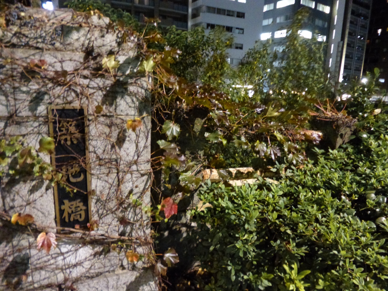 平成通りを銀座から日本橋方向へ進み、首都高速道路を越えたところに「築地橋」があります。このあたりまで来ると、銀座とは光景がかなり異なり、のんびりした印象の街並みになります。築地橋は欄干に蔦が絡まり、何とも言えない雰囲気のある姿でした。