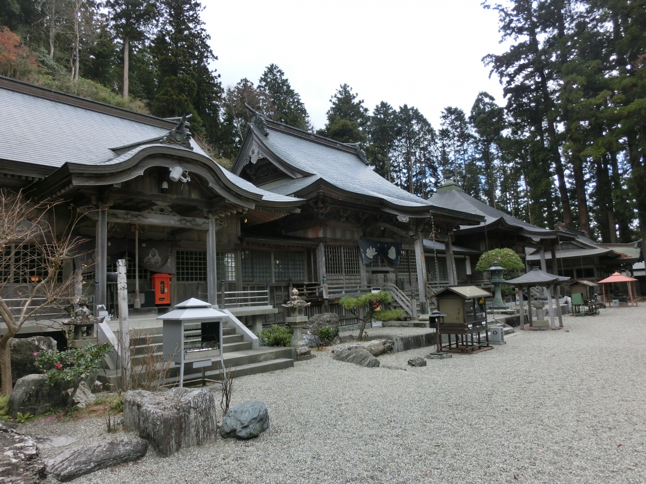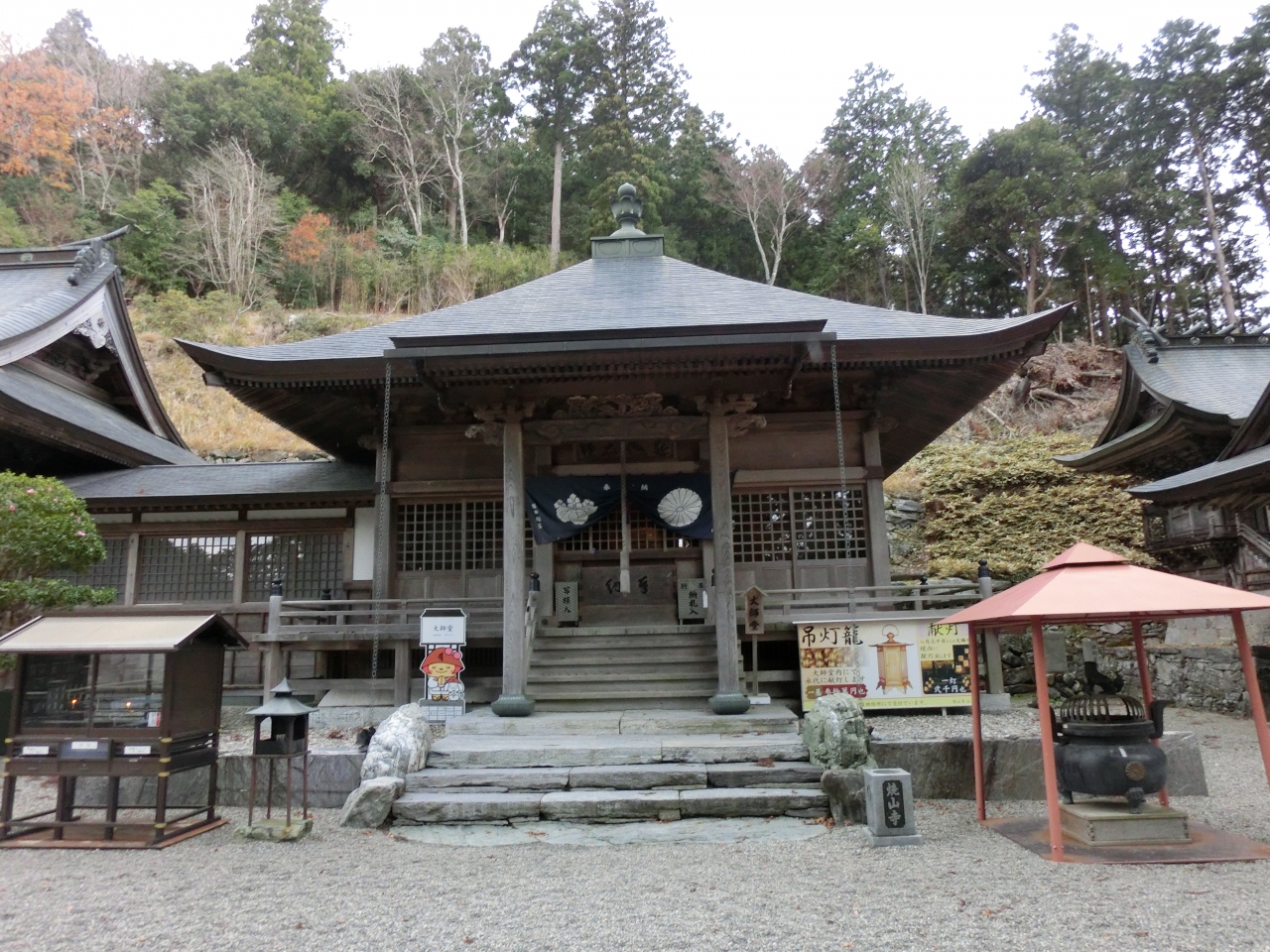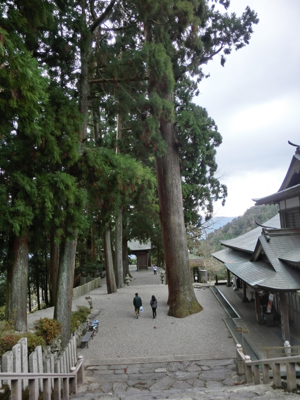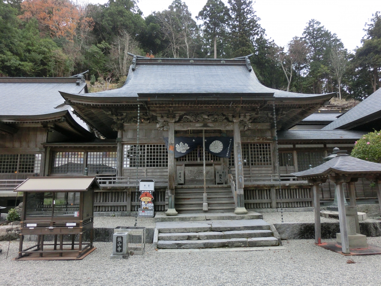 四国八十八カ所札所巡りの3泊4日の一人旅の二日目12月8日土曜日に一番の難所である12番札所焼山寺を参拝しました。歩き遍路では11番藤井寺から「遍路ころがし」と呼ばれる険しい山道を6時間歩きますが踏破できる自信がないので焼山寺山の麓までバスを使いそこから1時間程登るルートを選びました。当日はJR鴨島駅と11番藤井寺を徒歩で往復した後。鴨島10時58分発のJRに乗り府中(こう)駅に11時15分に着きました。徳島バス府中バス停そばのセブンイレブンでBLTサンド、あんまん、午後の紅茶で腹ごしらえをして府中12時5分のバスで寄井中まで出ます。寄井中着は12時52分、寄井中から神山町営バス13時発で焼山寺(鍋岩)に13時10分に着きました。バスの運転手さんに聞くと焼山寺まで徒歩1時間半という答えに少し不安を感じました。帰りのバスが16時31分ですので往復の3時間を引くと残り20分程しかありません。焼山寺への遍路道を急ぎ登ります。事前にネットで検索しましたが藤井寺から焼山寺への遍路ころがしと焼山寺から下山して鍋岩経由大日寺へ向かうルートは正規の遍路道ですので経験談を含め情報が豊富にありますが私が歩こうとする鍋岩からの登り道に関する情報は僅かしか見当たりませんでした。最初のうちは快調だった足取りも意外と険しい山道に息が切れ始め、途中の杖杉庵で参拝、一休みしました。ここから先の山道は本当にきつかったです。途中、自動車道と交差する場所があり車が楽々と登って行くのを恨めしく眺め、自分の激しい息遣いだけが聞こえる静かで薄暗く寂しい山道を南無大師遍照金剛と心中で唱えながら登りました。14時20分過ぎ、ようやく山門に到着しました。山門前の大師像が慈悲深いお姿で出迎えて下さいました。お寺は標高930mの焼山寺山の山腹700mの地点にあります。登り始めた鍋岩が標高230mで1時間10分掛かったことになります。山門をくぐると両側に杉の巨木が並び立つ参道となり奥の石段を上った先に本堂があります。石段右側に歴史を感じる鐘楼がありましたので鐘を有難く撞かせて頂くと風格ある響きが山間に長い余韻を残しました。本堂左手に大黒天堂、右手には大師堂、十二社神社と堂宇が建ち並びます。境内に漂う空気は登り始めた山麓とは全く違い、頬を刺すような冷気とぴんと張りつめたような霊気を感じます。本堂左手の方丈前の広場に親子のお地蔵さんが小さな愛くるしい姿で並んでおり、その先に望む山並みの景観が疲れを癒してくれました。お寺には多くの参拝客が居りましたが皆さん車遍路の方々だったと思います。名残惜しいですが余裕を見て14時55分に焼山寺を後に登って来た道を下山します。下りは膝に負担が掛かるので注意しながら山道を下りましたがさすがに下りは早く15時50分におへんろ駅の広場に着きました。下りは55分でした。16時31分の神山町営バスまでたっぷり時間がありますが広場には休憩所や自販機もありません。寒い中、トイレ脇のベンチで待っているとある旅行会社の観光バスが大勢の方々を乗せて広場に入って来ました。この先、大型バスでは登れないのか広場に待機していたマイクロバスとタクシーに分乗して焼山寺に登っていきました。最後にハプニングが起きました。16時半を過ぎてもバスが来ません。おかしいと思って道を眺めるとバス停は広場ではなく50m程先の別の場所です。来た時に降車した場所を完全に勘違いしていました。気が付いた時は後の祭りでバスは出てしまったようです。行きのバスで偶々一緒になり山道の往復を同行した大阪の方とバス停で呆然としていると車が停まり御親切にも「よかったら乗っていくか」と声を掛けて下さいました。バス停そばにお住まいの方で毎晩、神山温泉に通っているとのことですが我々の困っている様子を見て出てきてくれたようにも感じました。寄井中まで送って頂き寄井中16時54分の徳島バスに無事乗ることができ予定通り18時に徳島駅に戻りました。事前の計画では、万一、神山町営バスに乗り遅れた場合は寄井中まで歩き寄井中18時3分のバスで徳島に戻るつもりでした。但し18時3分のバスは日曜日運休となるので当初土曜日に予定していた6番札所から10番札所を日曜日にずらし11番と12番を土曜日に入れ替えて万全の計画で臨んだつもりでしたが思わぬところでポカが出ました。暗くなる中、とても寄井中まで歩ける雰囲気ではなかっただけに今でも振り返ると冷や汗が出る思いです。地元の方の御親切に感謝の念で一杯です。今回の旅では徳島県の18の札所を巡りましたが全ての面において焼山寺が最も思い出深い参拝となりました。