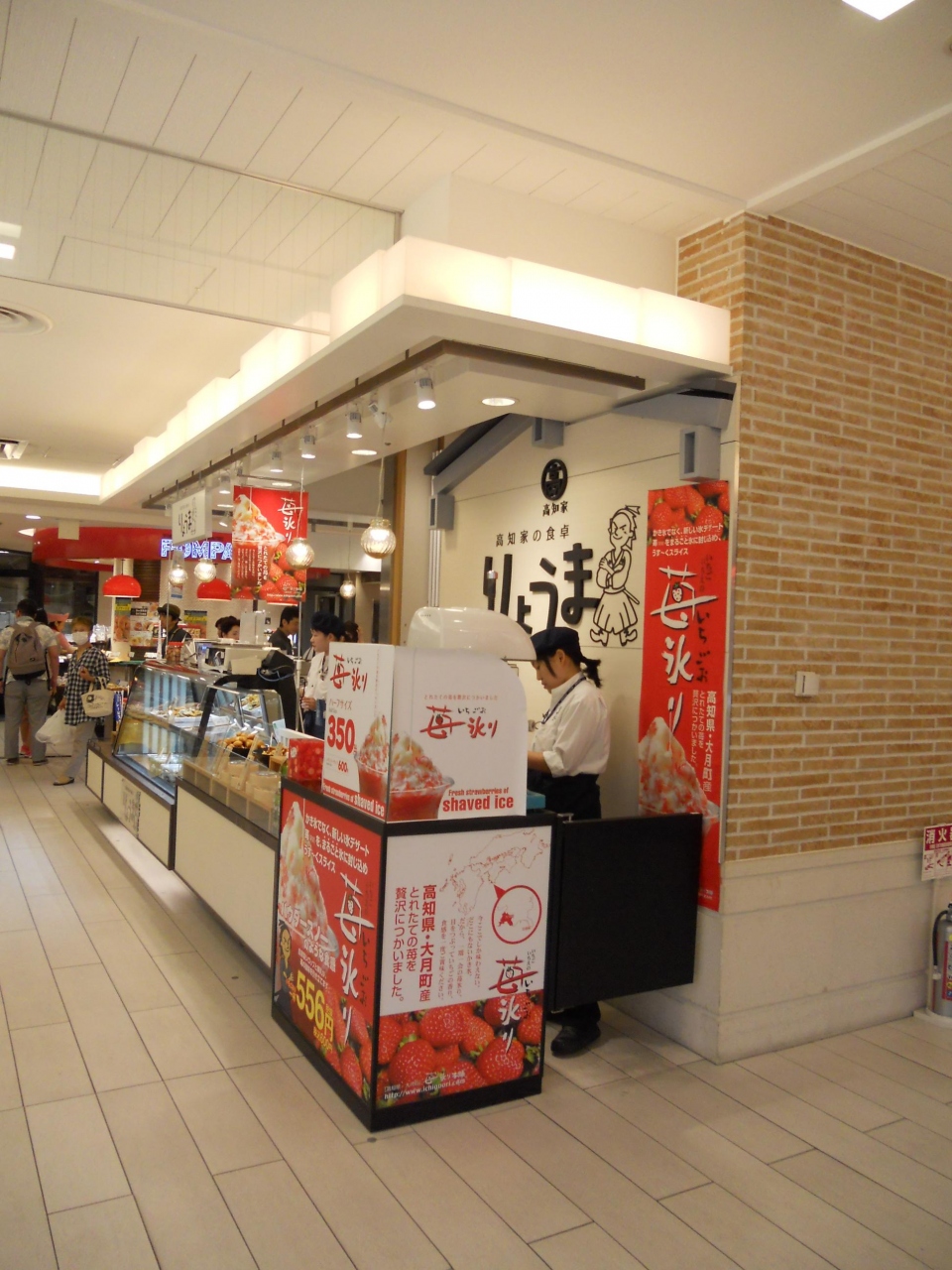 今回も2階のグルメコーナーをぐるりと周ってきましたが、前回は気づかなかった「高知家の食卓りょうま」さんの店頭で、イチゴのかき氷が販売されていたので、いただいてみました。