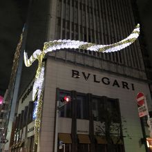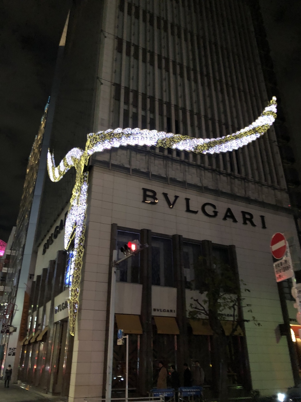 各店趣向をこらしたクリスマスのイルミネーションが楽しいこの季節、ブルガリはビル全体にヘビが巻き付く大胆なデザインでした。今期もモチーフも、バッグの金具が蛇の頭だったりするので、それででしょうか。ちょうど正時に通ったら、ヘビがキラキラしていました。