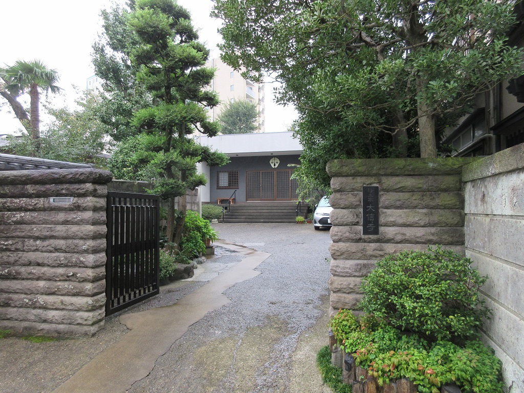 都営大江戸駅の神楽坂駅から坂を少し上がった先に、小さなお寺があり立ち寄りました。そこが大信寺で、門柱から本堂までアスファルトで舗装されていて、本堂は格子戸がはめ込まれた平屋建て、コンクリート造を思われる近代的な造りでした。控えめな雰囲気で好感が持てました。