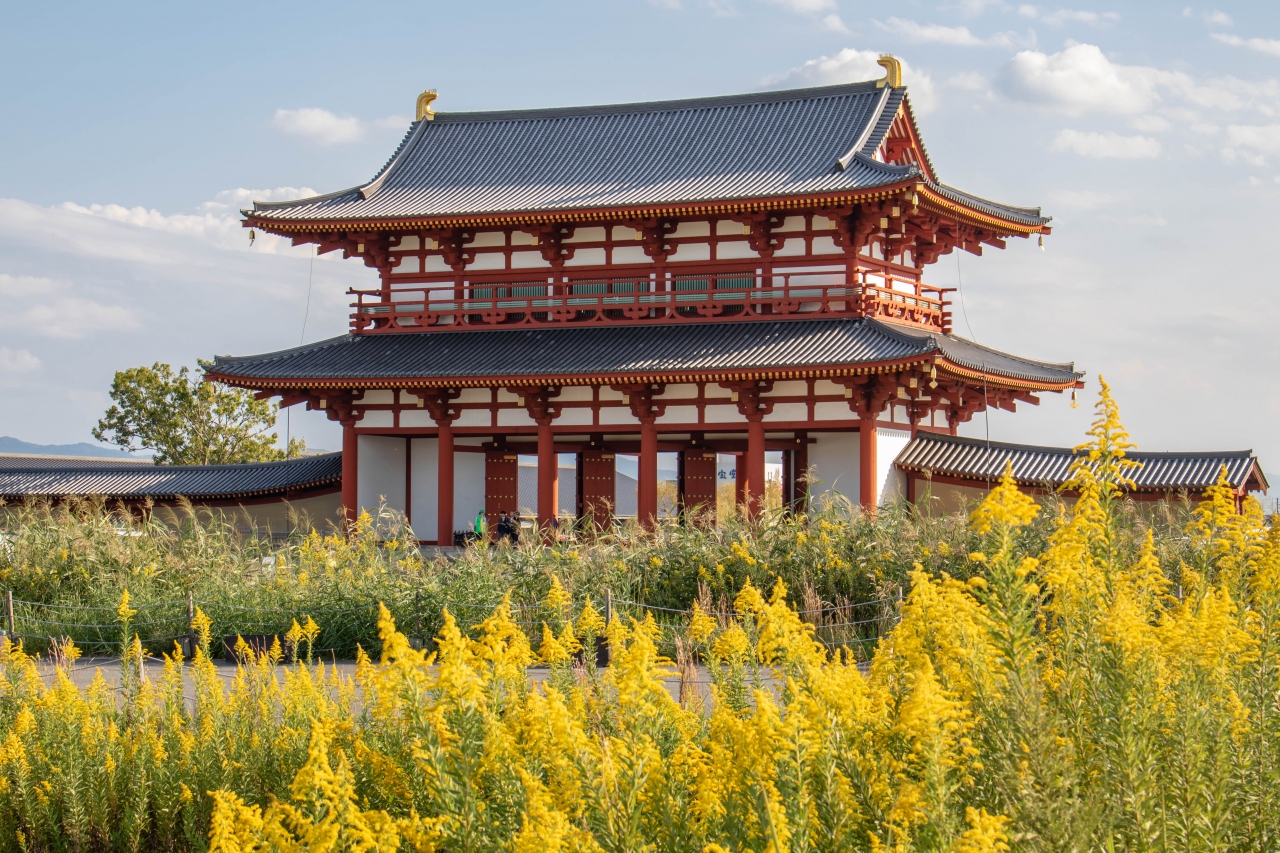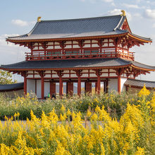 かつての平城京の正門で、資料がないため、当時の中国の建物などを参考に再現されたとのことです。この朱雀門から大極殿の間には線路が走っており、踏切を渡らなければなりません。この踏切が通れるのは日中だけなので注意しましょう。