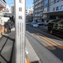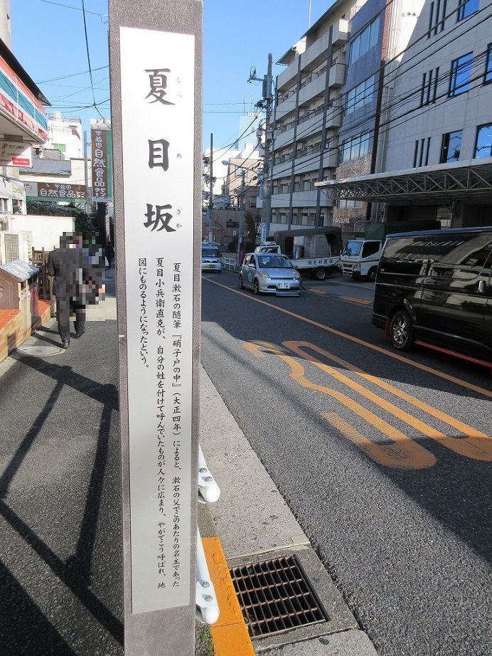 地下鉄早稲田駅をおりて、南に向かった上がっていく長い登り坂が「夏目坂」と名前がついており、細長い標識が設置されていました。夏目漱石のお父さんの時代にこの名前がついたとのこと。坂にそっていくつものお寺が並んでいて、散策するのにもってこいの坂道でした。