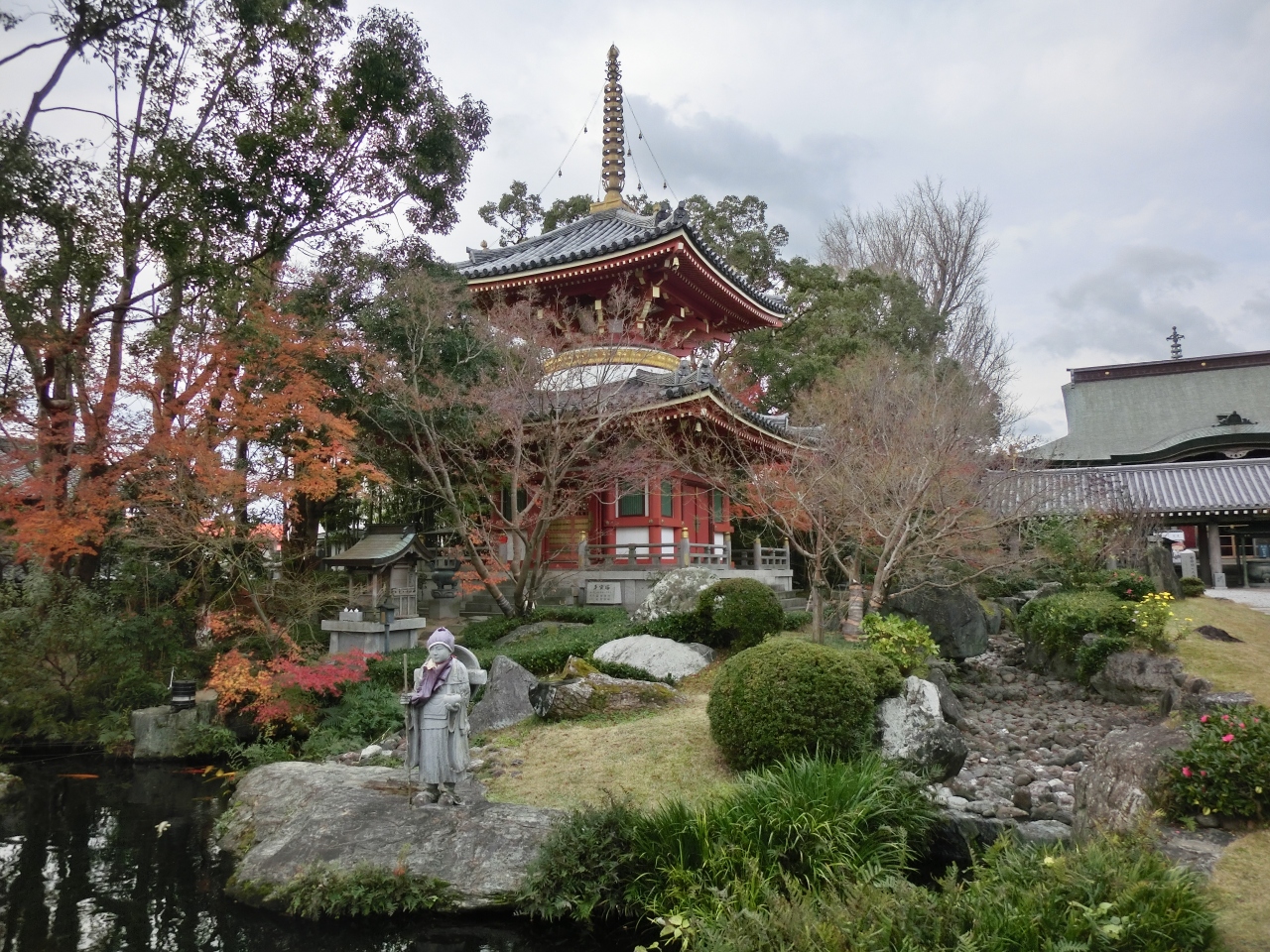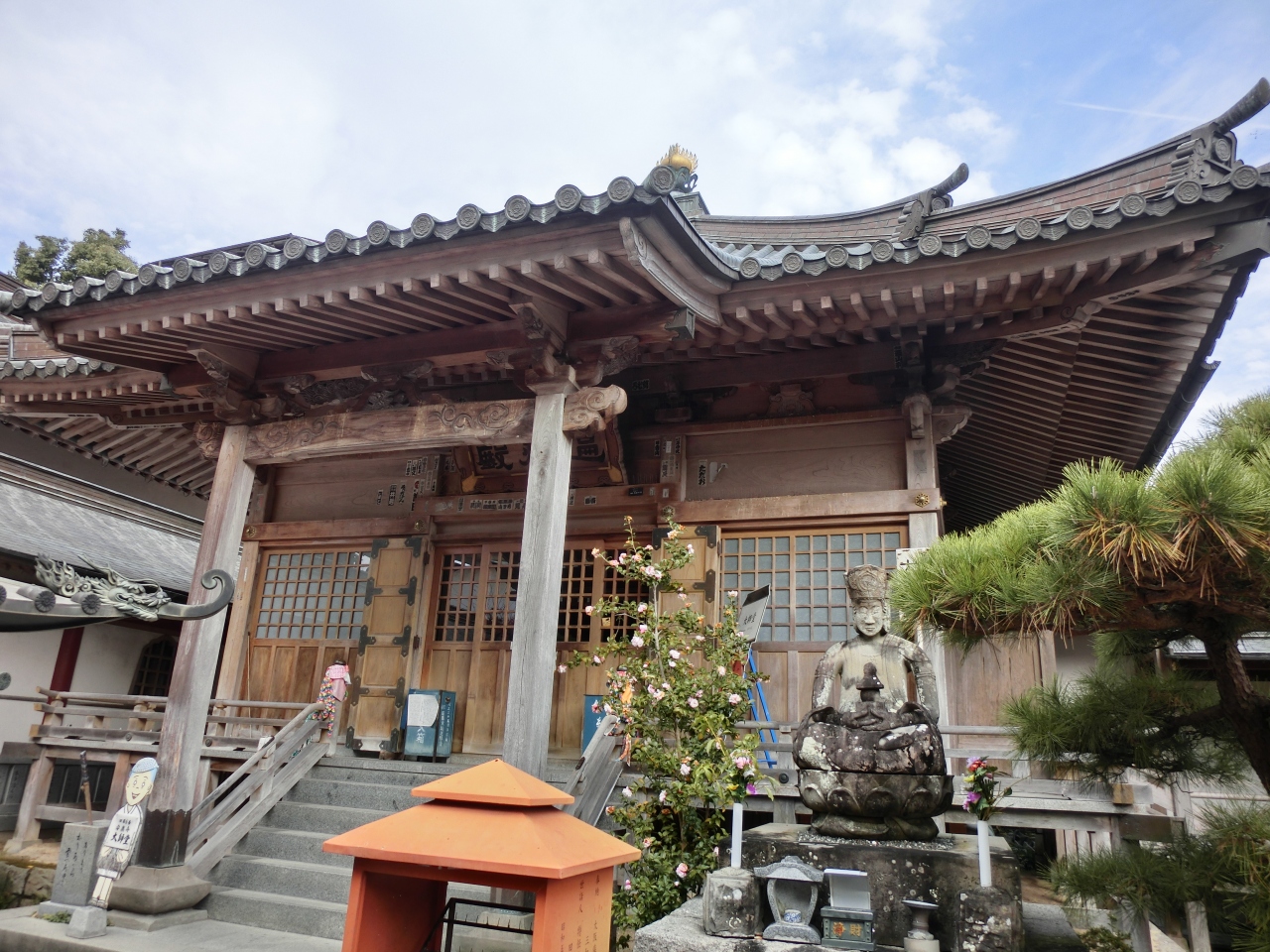 四国八十八カ所札所巡りの3泊4日の一人旅の三日目は6番から10番まで五つの札所を巡りました。六番札所安楽寺へは徳島駅前8時30分のバスで最寄りの東原まで行きました。東原には9時半に到着、以降は10番まで徒歩で参ります。安楽寺はバス停から5分程です。門がコンクリート造りの朱の山門をくぐると左に大きな池があり池越しに朱鮮やかな多宝塔が見えます。美しい塔です。本堂は真正面です。本堂前の横長の建物は2011年に建立された金剛宝拝殿で欄間に弘法大師の一代記が彫刻されています。正面から見ると宝拝殿と本堂は一体化しているように見え堂々たる構えです。大師堂は本堂右手にあります。大師堂の手前には大師伝説で有名な「厄除けのさか松」があります。手前には茅葺屋根の立派な方丈があります。納経所は荘厳な本堂内にあります。納経所の女性の御朱印の丁寧な対応と笑顔が印象に残ります。「よかったら後ろの籠からお持ちください」と御親切にも甘酒のボトルまで御接待下さいました。最高のスタートとなりました。