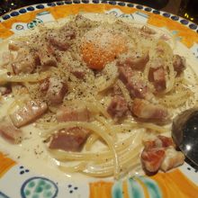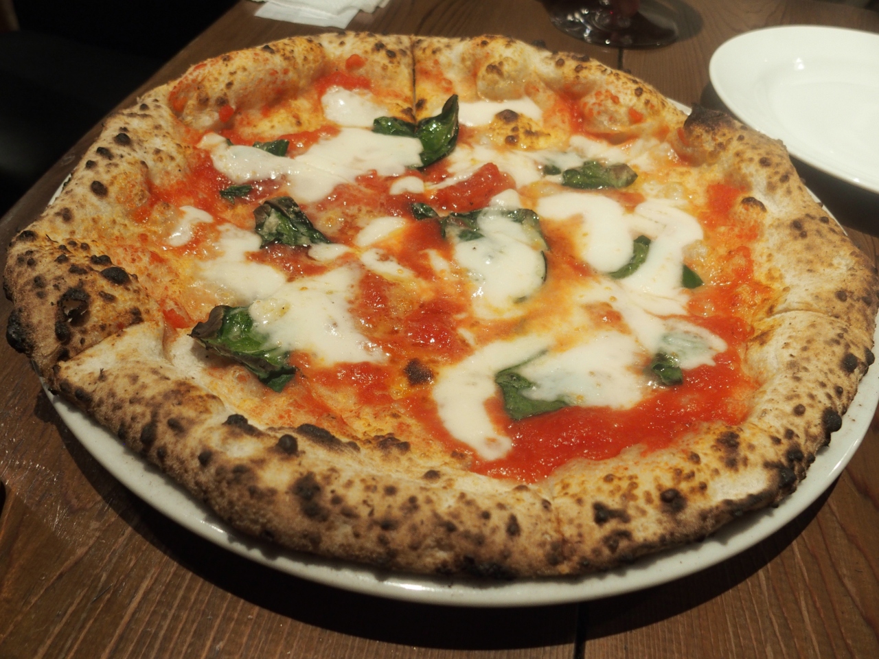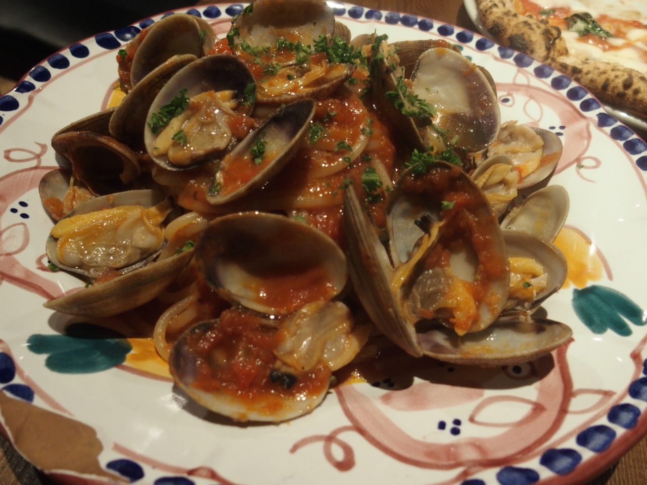 マルゲリータとボンゴレ、カルボナーラを注文しました。マルゲリータはさすがの1品。ぱりぱり、さくさくの触感に、トマトソースとよくあい、ふんだんな具在があふれんばかりに乗っていて、アツアツ、あっというまに平らげてしまいましした。ピザの名店ですが、パスタもなかなか。カルボナーラも、濃厚な卵のクリームソースに、ベーコンがふんだんに刻まれ、満足の1品です。