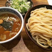 新宿駅(西口)から徒歩5分程。ヨドバシカメラなどが並ぶ一角にあります。つけ麺は、同一料金で中盛り(400グラム)、大盛り(580グラム)と麺の量を選ぶことができます。魚介系の濃厚なつけ汁と中太麺が良く絡み美味しかったです。