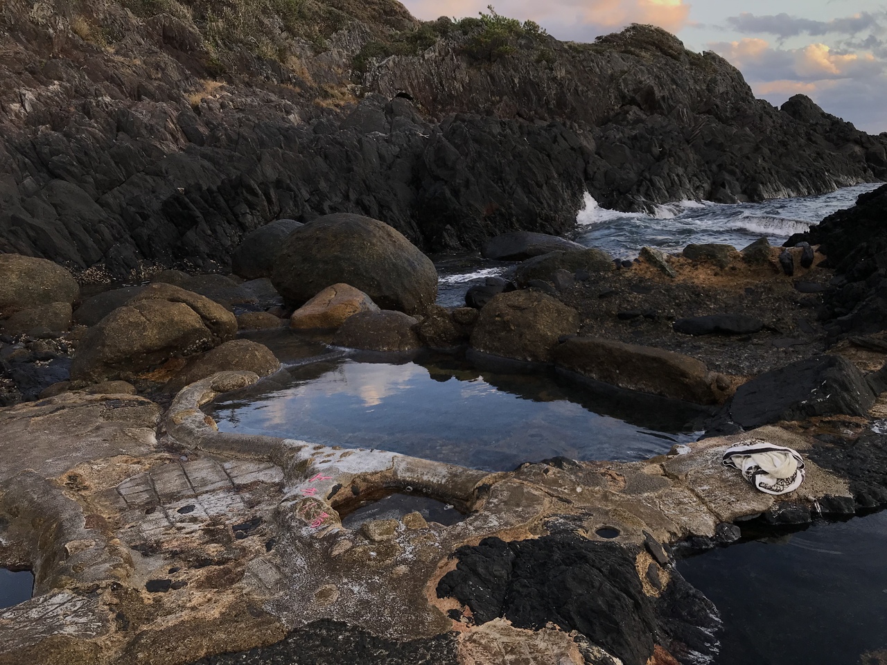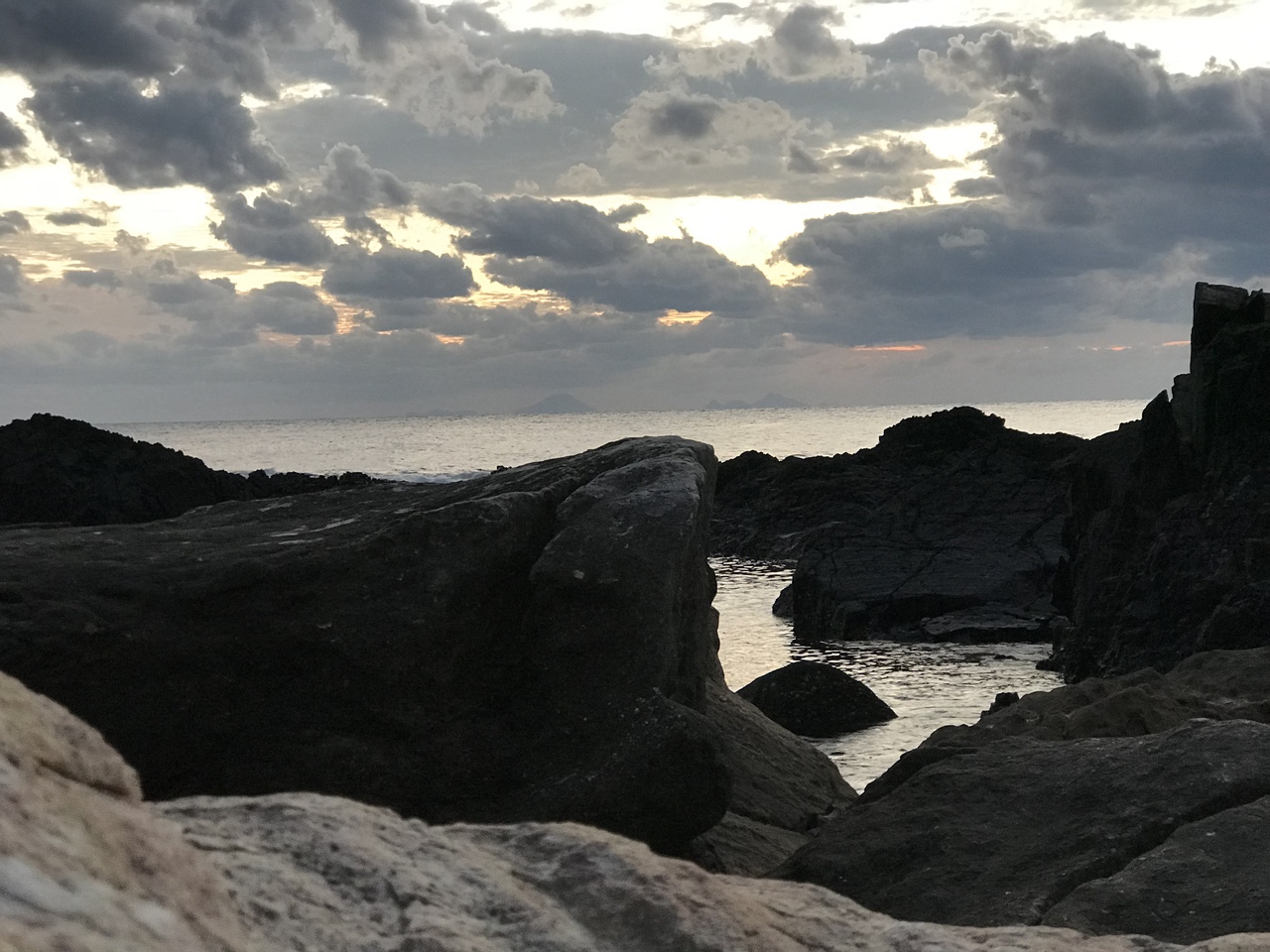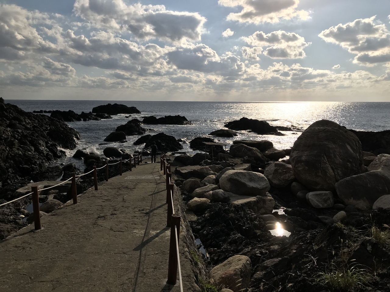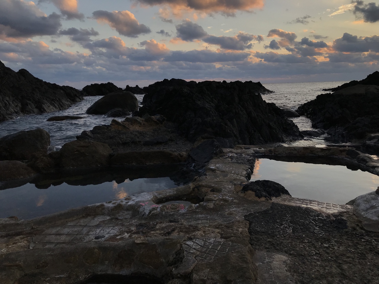 この日の干潮が19時で16:30くらいに行きました。3つ湯船があり、2つは海水が入ってきたりしてぬるめですが、真ん中の湯船が最高の湯加減でした。しかも大好きな硫黄の匂いがしました。源泉を飲んでみましたが、塩辛さはなく、硫黄臭が漂っていました。遠くには開聞岳も見え、まさに絶景!天気は晴れでしたが水平線に雲がかかって、沈みゆく夕日は見えませんでしたが、オレンジ色に染まる空を見ながら入るこの温泉は最高だと思いました。色々決まりがあり、靴はここで脱ぐとか、かけ湯をするようになっていたりします。遠くから写真を撮ったらおばさんに注意されました。地元の人たちも毎日のように利用されているので、ルールを守ることが大切でした。