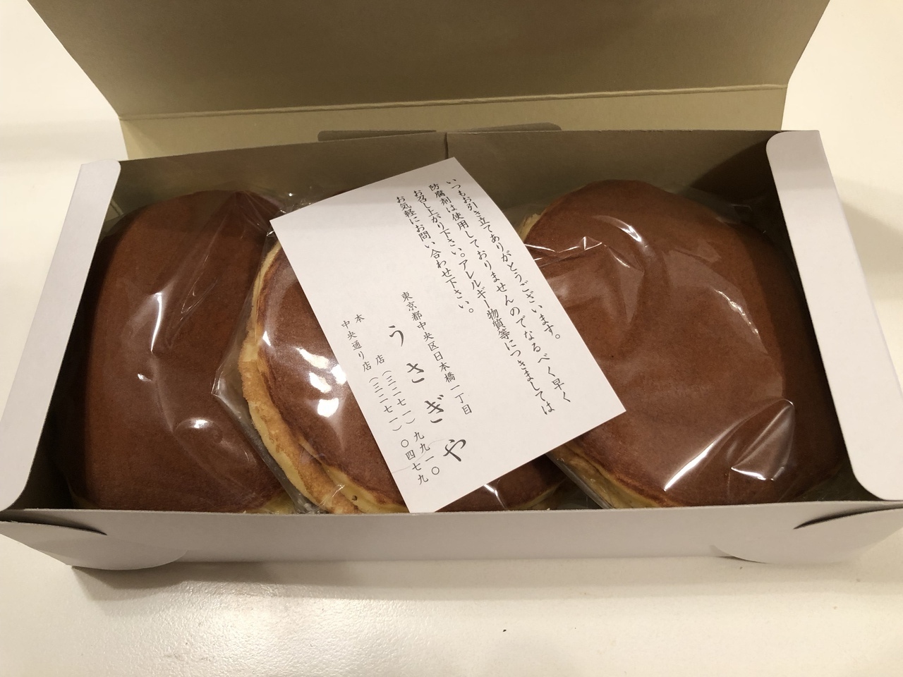 うさぎやのどらやきです。高級品です。コンビニやスーパーなんかで売っているものとは違います。特徴は中に入っている餡の甘さが抑え気味で上品な味といった印象。なので、甘いものが苦手な人でもいけるんじゃないかなと。自分で買っても良いし、お土産にも適した一品です。