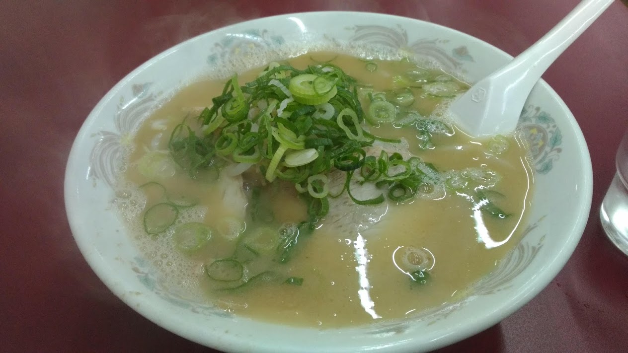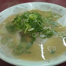 東福寺駅前にはお手軽な食事処が何軒かありますが、その中にある小さなラーメン店で、奥にカウンター席、手前にテーブル席があります。ラーメンが500円というお手軽値段で、あっさり系豚骨ラーメンが楽しめます。テーブルに辛子味噌があるので味を調整できます。チャーシュー麺でも600円台とうれしい値段です。