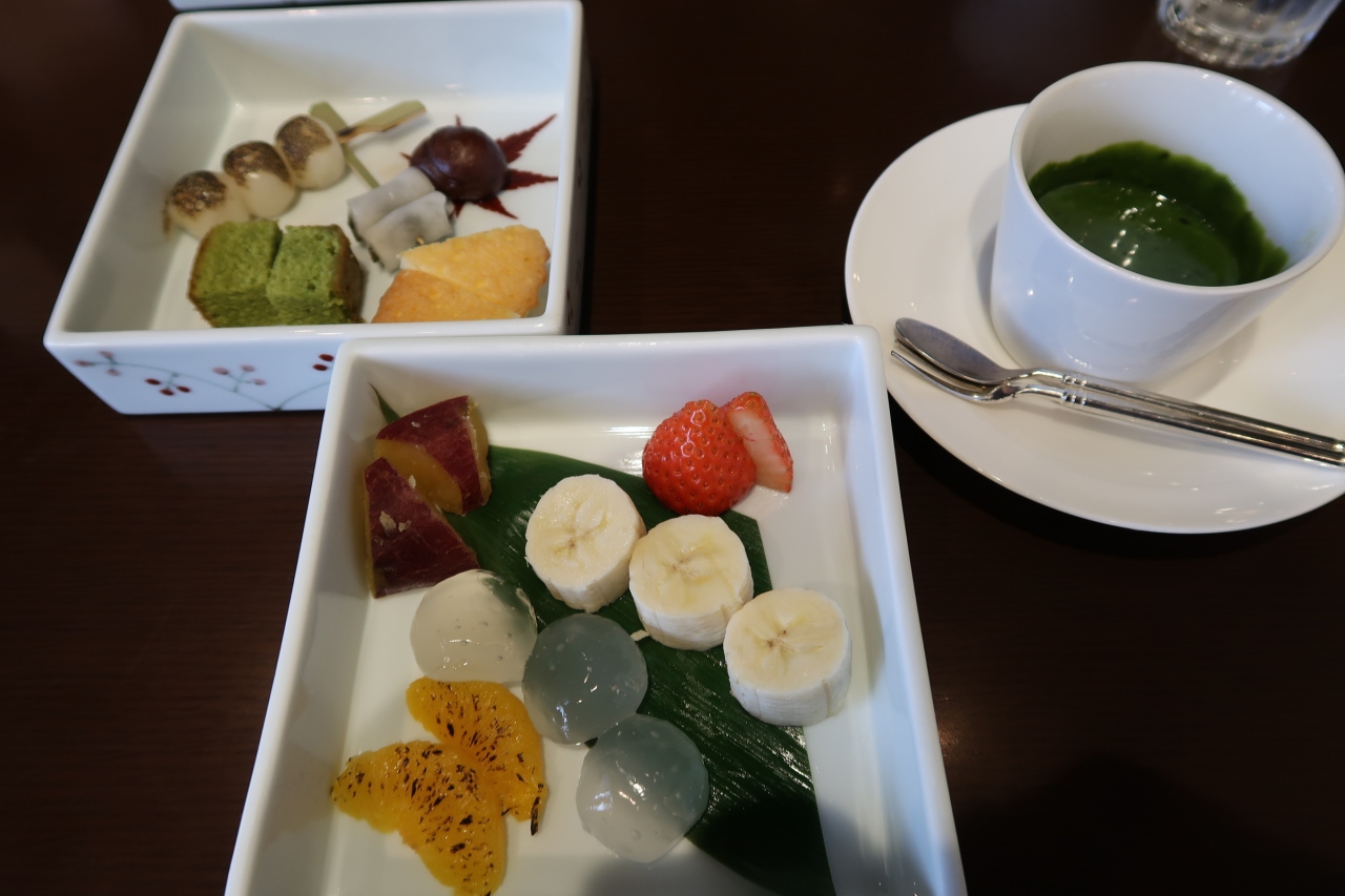 濃厚抹茶ソースに団子やフルーツをくぐらせて頂きます。
