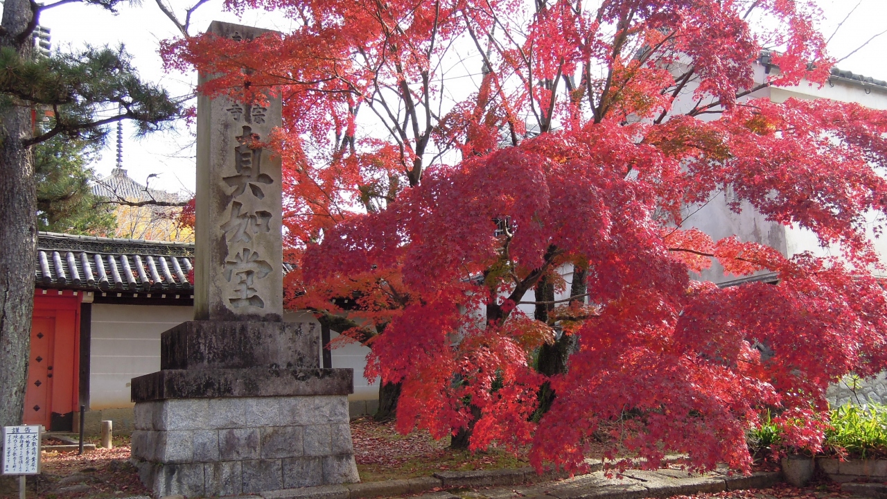 入口に真如堂と書かれた石碑があり横には紅葉が真っ赤になってました。