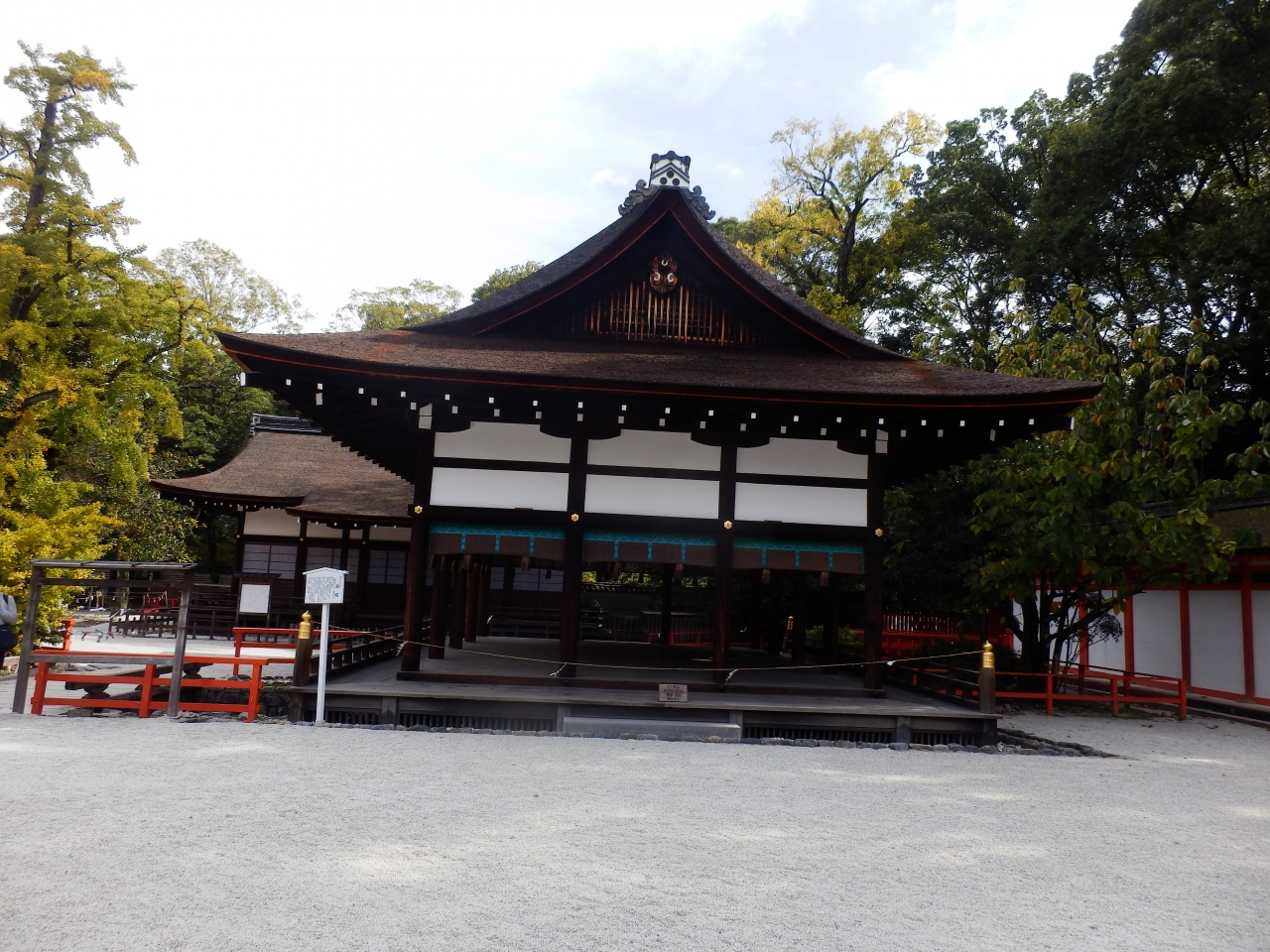 下鴨神社が挙行する御葵祭の時神社の御神宝を奉納する御殿<現地設置の説明板記載>、すぐ横にある舞殿によく似た建物で四方からから眺められ開けっ放しの建物,建物の床下に幅3M程の清流(御手洗川⦆が流れており古の京都を感じさせる