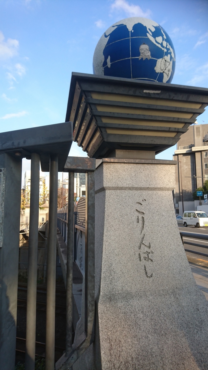 1964年の前回オリンピックの際にJR線路を跨いで架けられた五輪橋を渡りました。神宮橋の隣に架かっており、明治神宮前で表参道から代々木方面に向かっていく橋で、とても交通量の多い橋でした。親柱には地球のモニュメントがつけられており、オリンピックを連想させます。