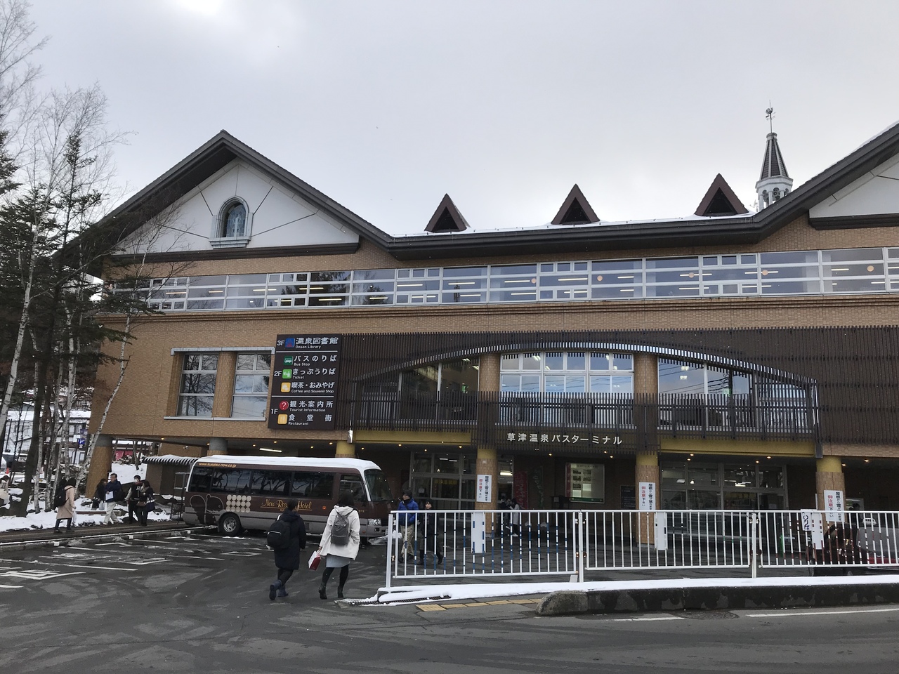 草津温泉までは電車では、長野原草津口や軽井沢まで行き、バスに乗り換えて、こちらのバスターミナルに着きます。そして、ホテルの送迎バスを利用するのが一般的です。