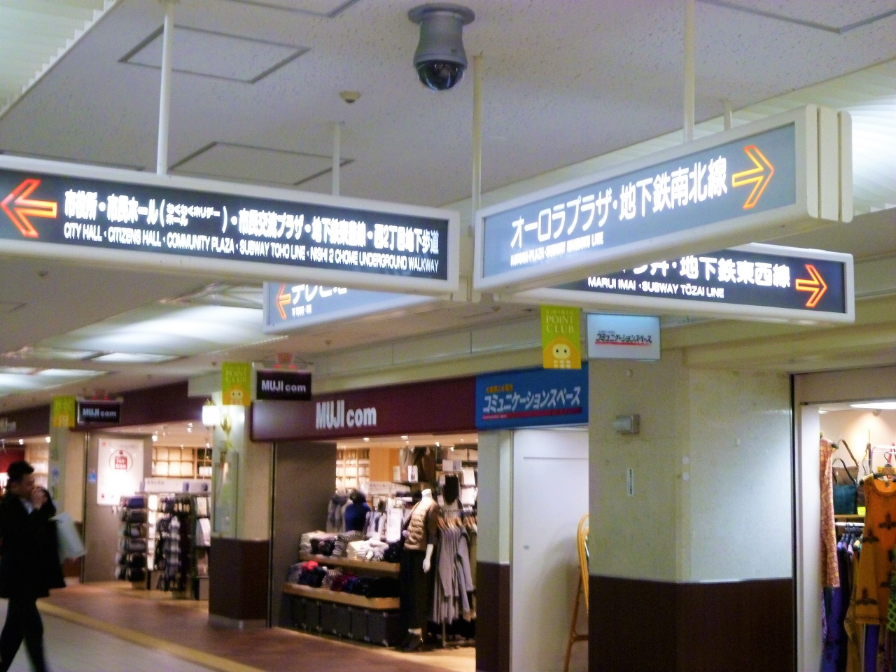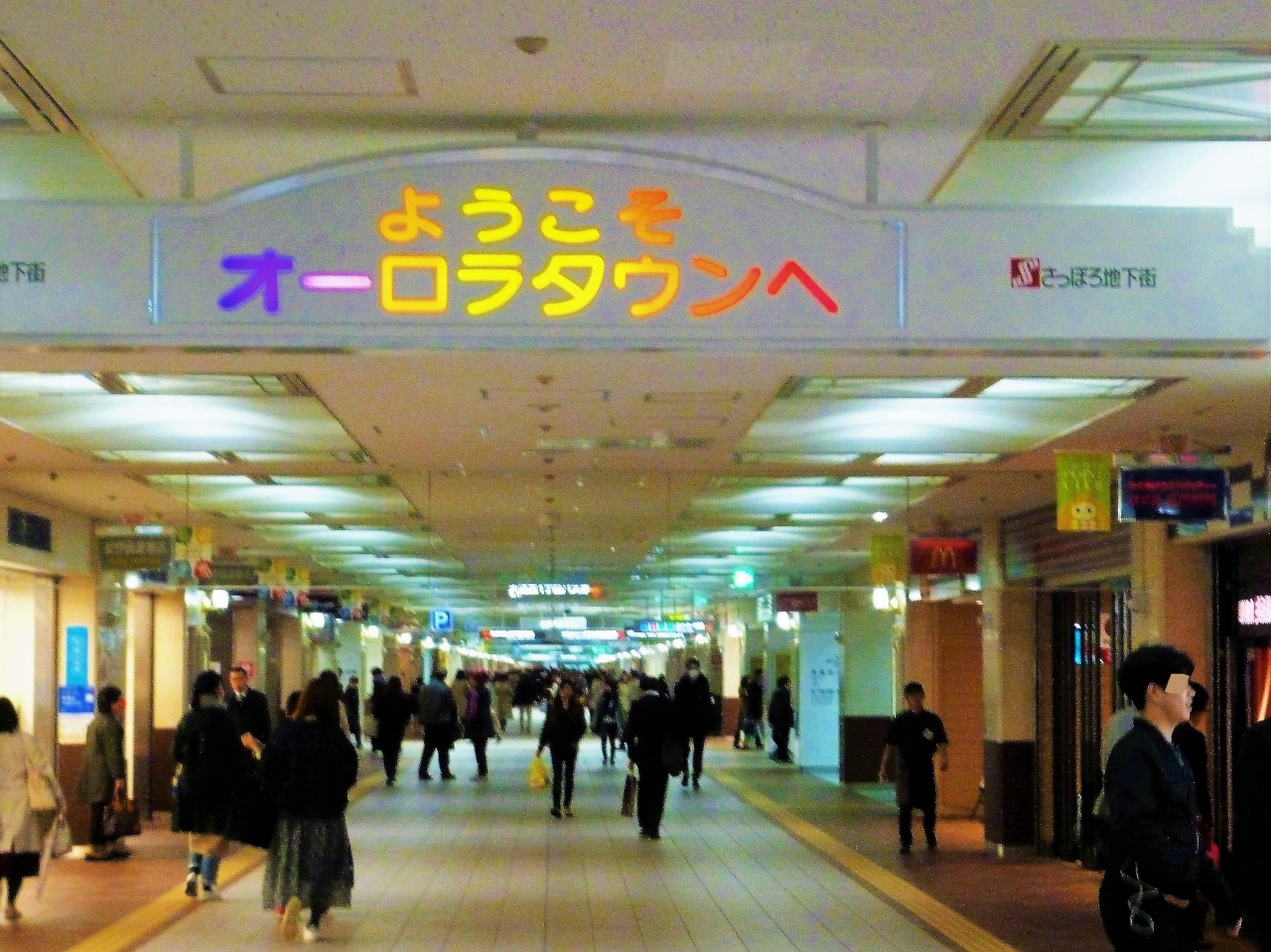 テレビ塔の地下1階に行くと通じていました地下街オーロラタウンに…天井(庇)に[ようこそオーロラタウンへ]と虹色で書いてました(横に`さっぽろ地下街`があるので札幌の地下街には`虹色`で同じ文面が?)。 ゆったりとした通りに柱と柱の間にはお店がありました;柱の間隔は思ったより狭く大地震に備えているが分かり安心です! 18時頃でしたので高校生やMr&Ms会社員が多く`大通り`ですね(^^) きちんと通路案内が。