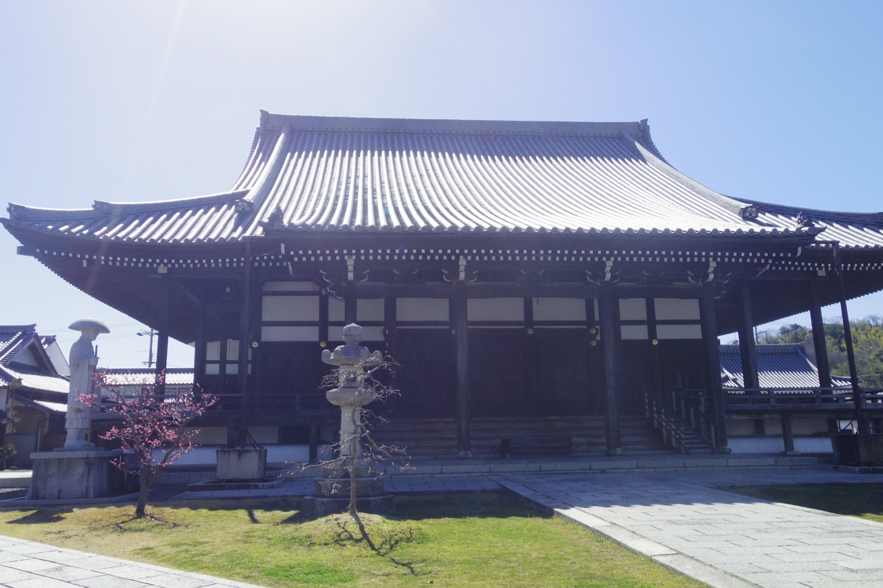 中は広々としているお寺。親鸞上人と蓮如上人の像が両脇に向かい合う形で立っていました。訪れた時は他に誰にも会わなかったのですが、梅が咲いていて桜も咲き始めた頃で、良い天候の下で咲く花も見れてイイ気持ちになりました。