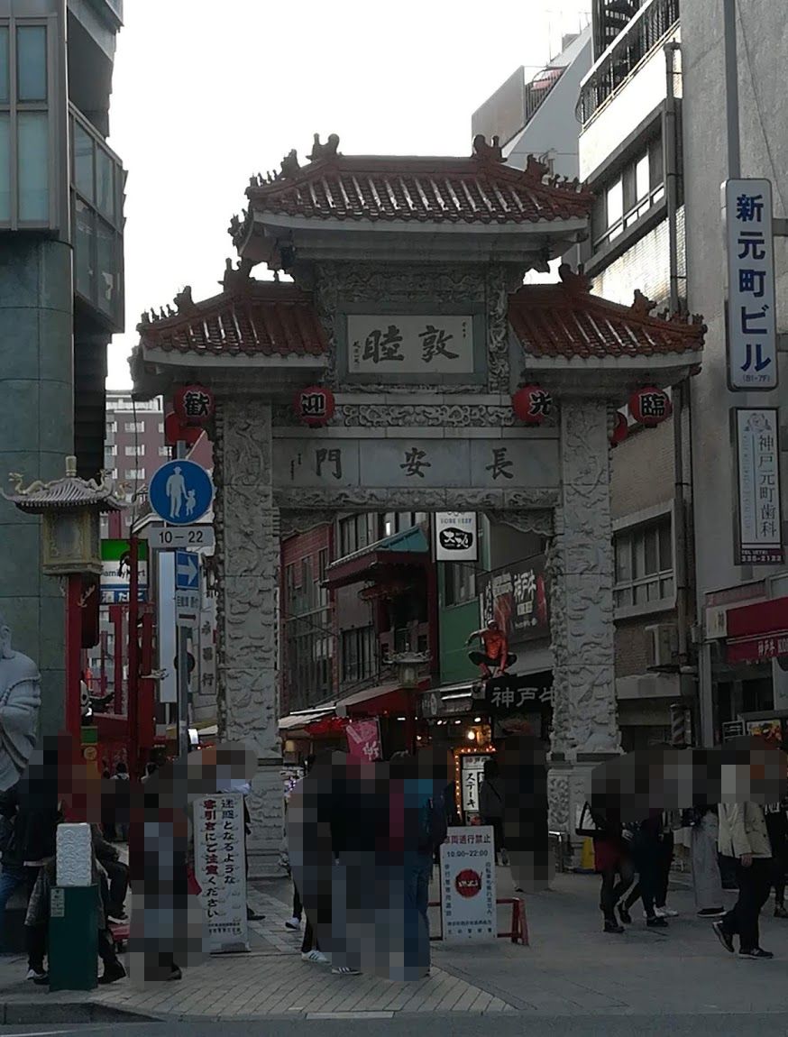 元町駅から徒歩で数分ほど南に行ったところにある、神戸中華街の東側の門で、縦長のものでした。2層構造になった屋根部分やその周囲の彫刻もきれいなものでした。ここからいよいよ中華街に入るぞといった気持ちになりますね。