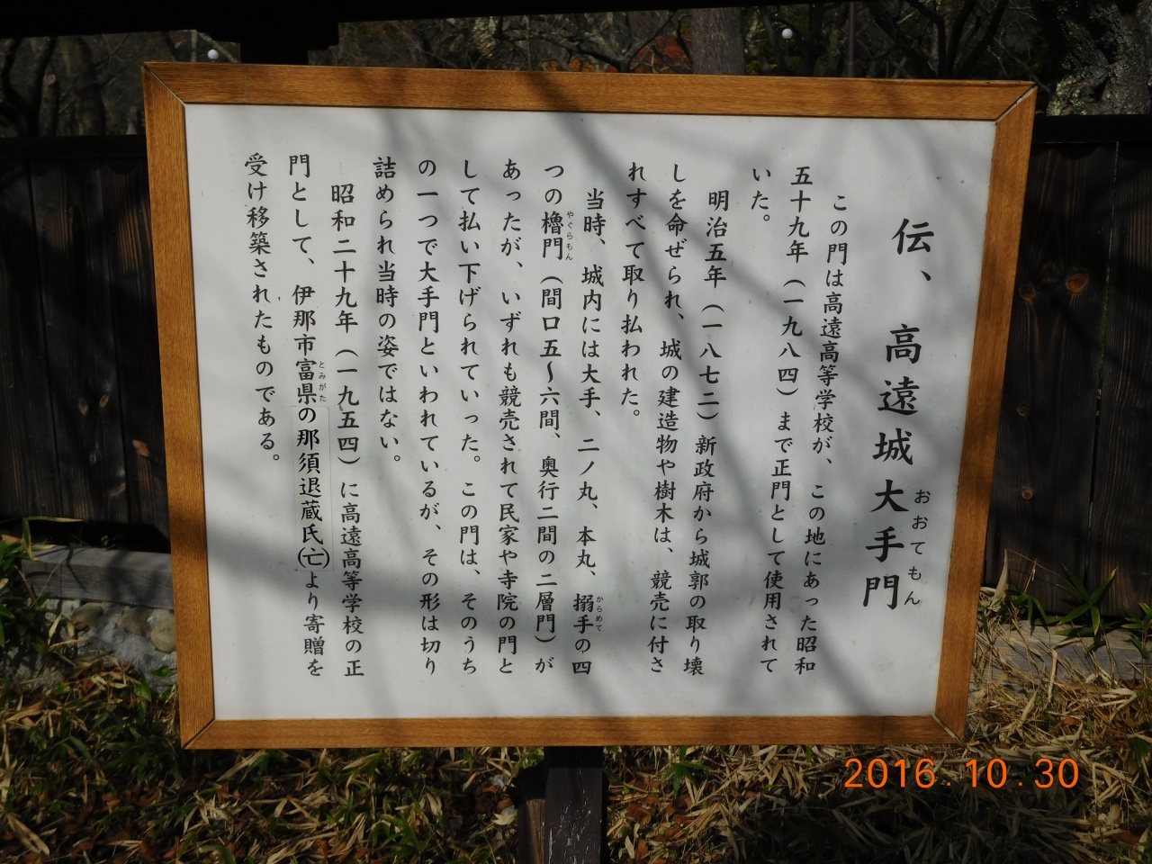 解説を読むと、どうやら廃城後に高遠高等学校の正門として使われていたようで、切り詰められ、当時の形ではないそう。この一文をみて、なんだかほっとした気持ちになったのでした。