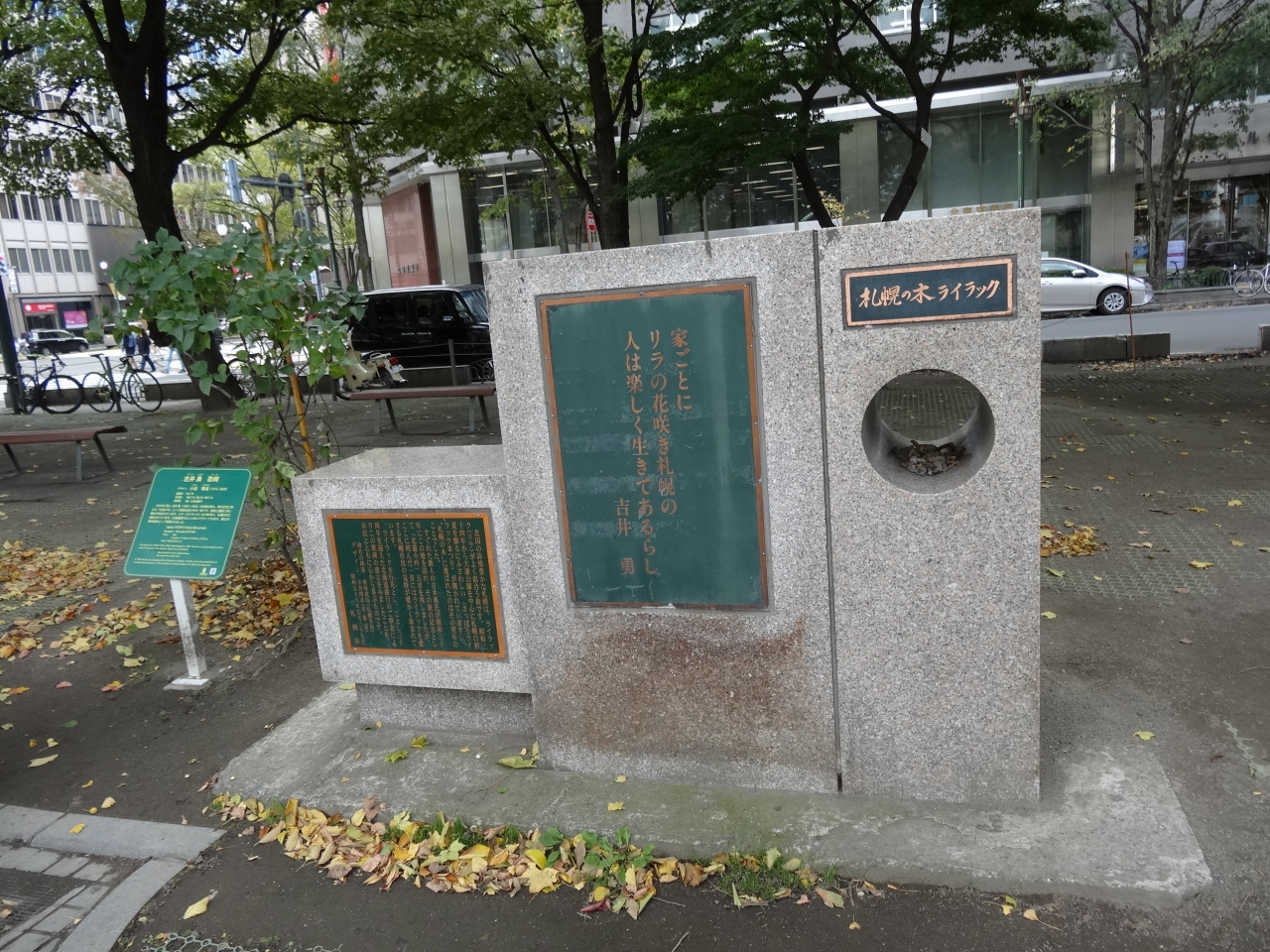 札幌大通公園の中ほどの端にある記念碑です。ライラックが札幌の木であることを初めて知りましたが、1960年に指定されてそうです。その約20年後に設置された記念碑(歌碑)です。ひっそりとあり結構歌碑としては立派なものですが、何度も訪れている大通公園内にあっても目立つ存在ではなく初めて気が付きました。道内にはほかにもたくさんの歌碑があるので歌碑巡りもいいかもしれません。