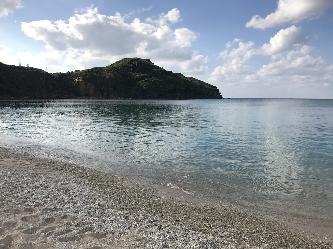 珊瑚が砕けたっぽい砂浜と、透明からエメラルドグリーンを経て青に至る海の色が素晴らしい!そして浜越しに西崎が見えるのもいいです。
