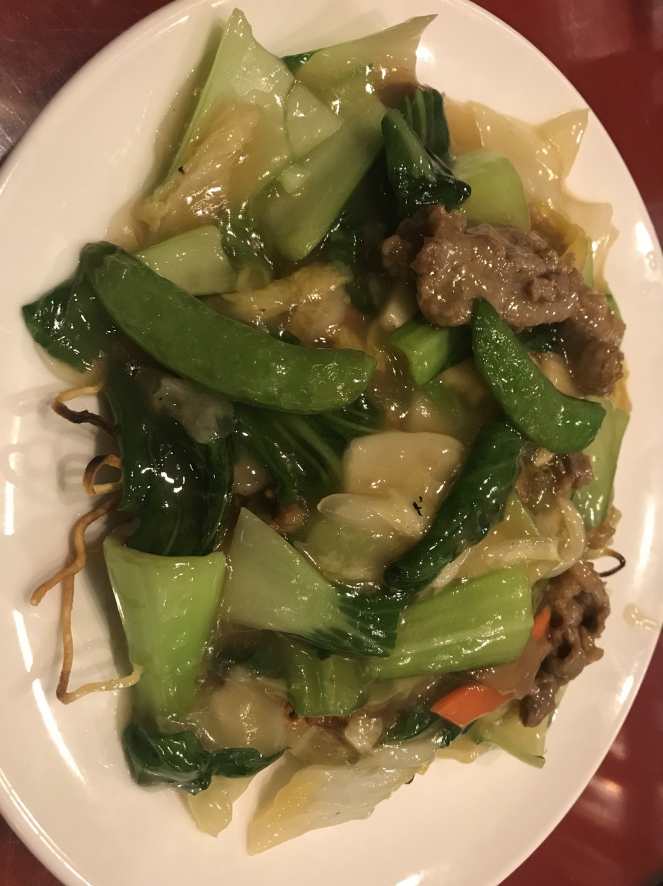 リピートしている広東料理屋さん。夜でも、一人でサクッと頂くことができます。牛肉かたやきそばをオーダー。メニュー名は違ったきがします。980円税込。お野菜もたっぷりで、餡は優しいお味です。お茶もでてきます。