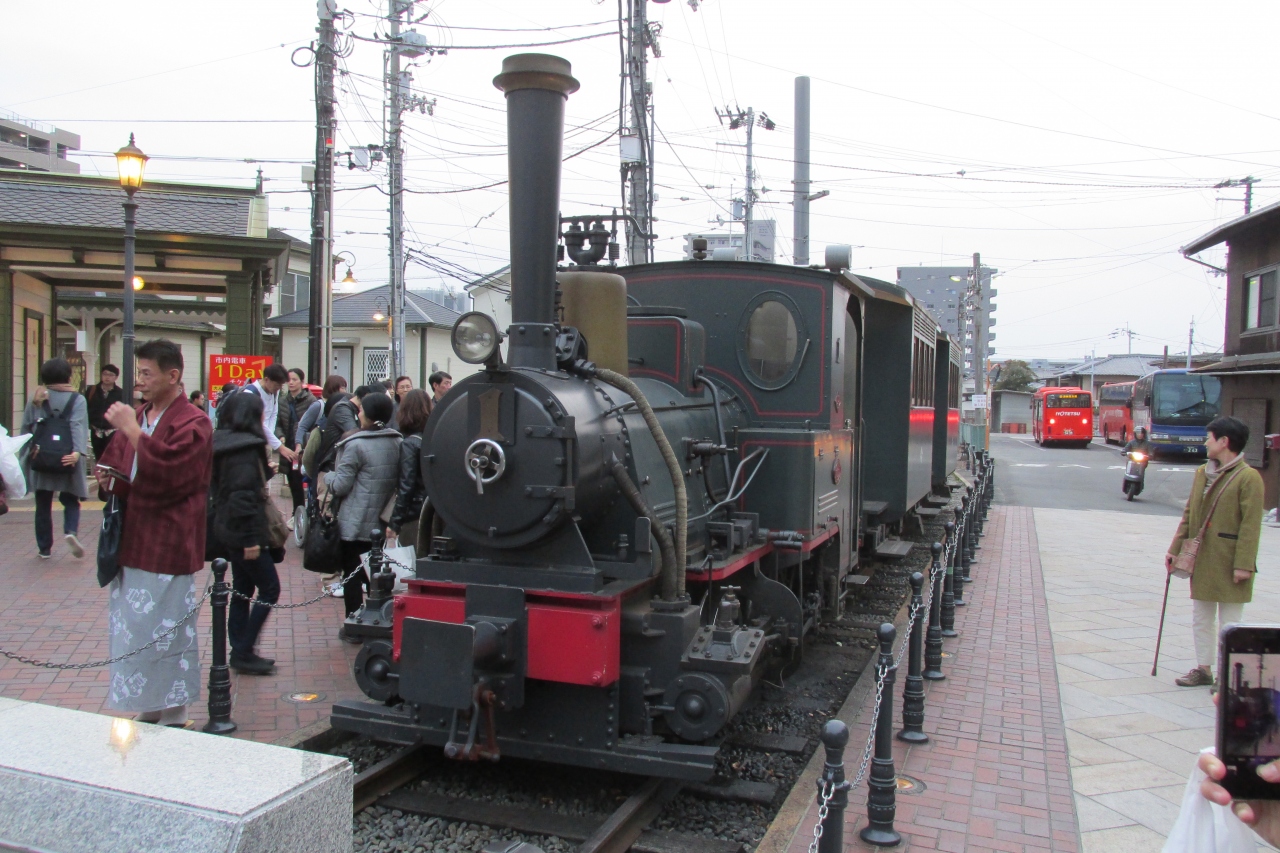 伊予鉄の路面電車の中で、この坊ちゃん列車は観光客向けです。団体客は予約ができるようです。伊予鉄の1dayチケットでは乗ることができません。800円かかるので割高感があります。道後温泉駅では坊ちゃん列車が観光客に囲まれていました。
