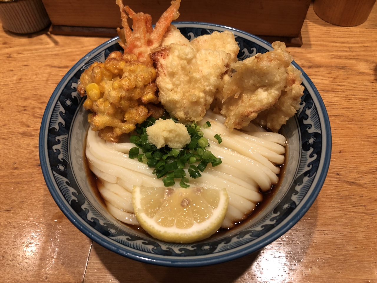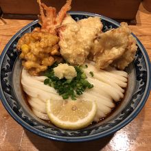 鶏天は、小さ目が5個、やわらかくおいしい。他に、とうもろこしとにんじんのかき揚げも付いていて、これもおいしい。