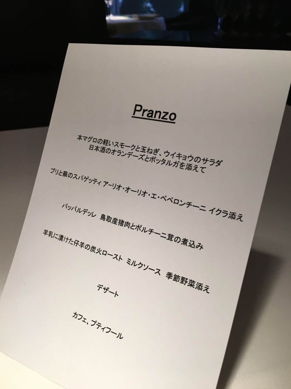 Pranzoという前菜、パスタ料理2品、メイン、デザートとコーヒーというコース料理にしました。以前は数種類の中から選べたのですが、今回はデザートと食後の飲み物以外は全て決まっていて選べませんでした。ただ、苦手食材は言えば別のに変えていただけます。