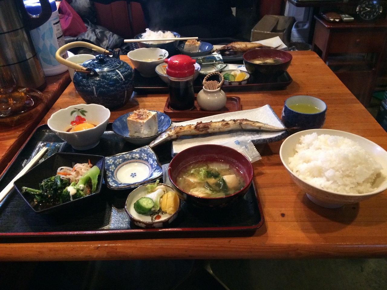 宿泊したホテルが素泊まりの契約であったため、夜に引き続き朝も外で食事を摂るお店をスマホで探すことに。そこで良さそうな探してやってきたのがこのお店。年配のおばあさん一人でやりくりしているお店のようで、入店した時には漁を終えて朝食をここで摂り、NHKの朝の連ドラを見る漁師がたむろっていました。内装は全体的に古くさいですが、まあこれも入るとなじんできます。人気の干物定食が600円で、私は丸干しサンマを、連れはアジを選択しました。出てきたお盆には小皿も含めて大量の料理。おそらく体を資本とする漁師さん向けが基準なんでしょう。でも美味しいから米粒1つ残さず、サンマの骨と頭だけ残して平らげました。こんなお店が勤務先の近所に欲しいですね。