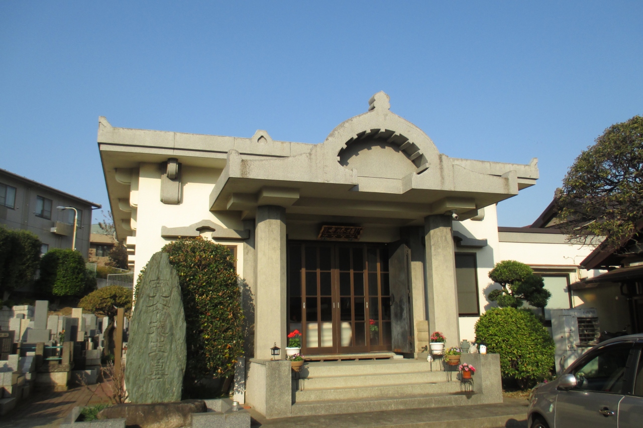 神田川の北側、小日向台地の南斜面を下った辺りにはお寺さんの密集地になっています。大きいお寺、小さなお寺といろいろですが、福勝寺はその中間くらいでしょうか。本堂の屋根の形が変わっています。築地本願寺をちょっと思い起こさせます。この本堂は、戦災に遭って仮本堂だったものから、昭和39年(1964年)に再建されたとのことです。