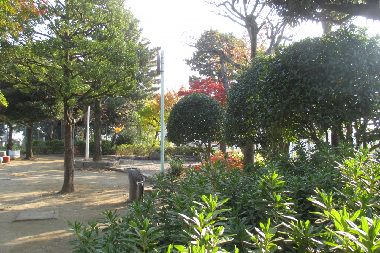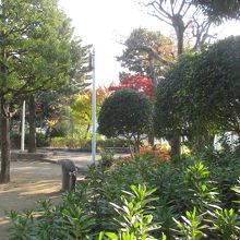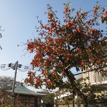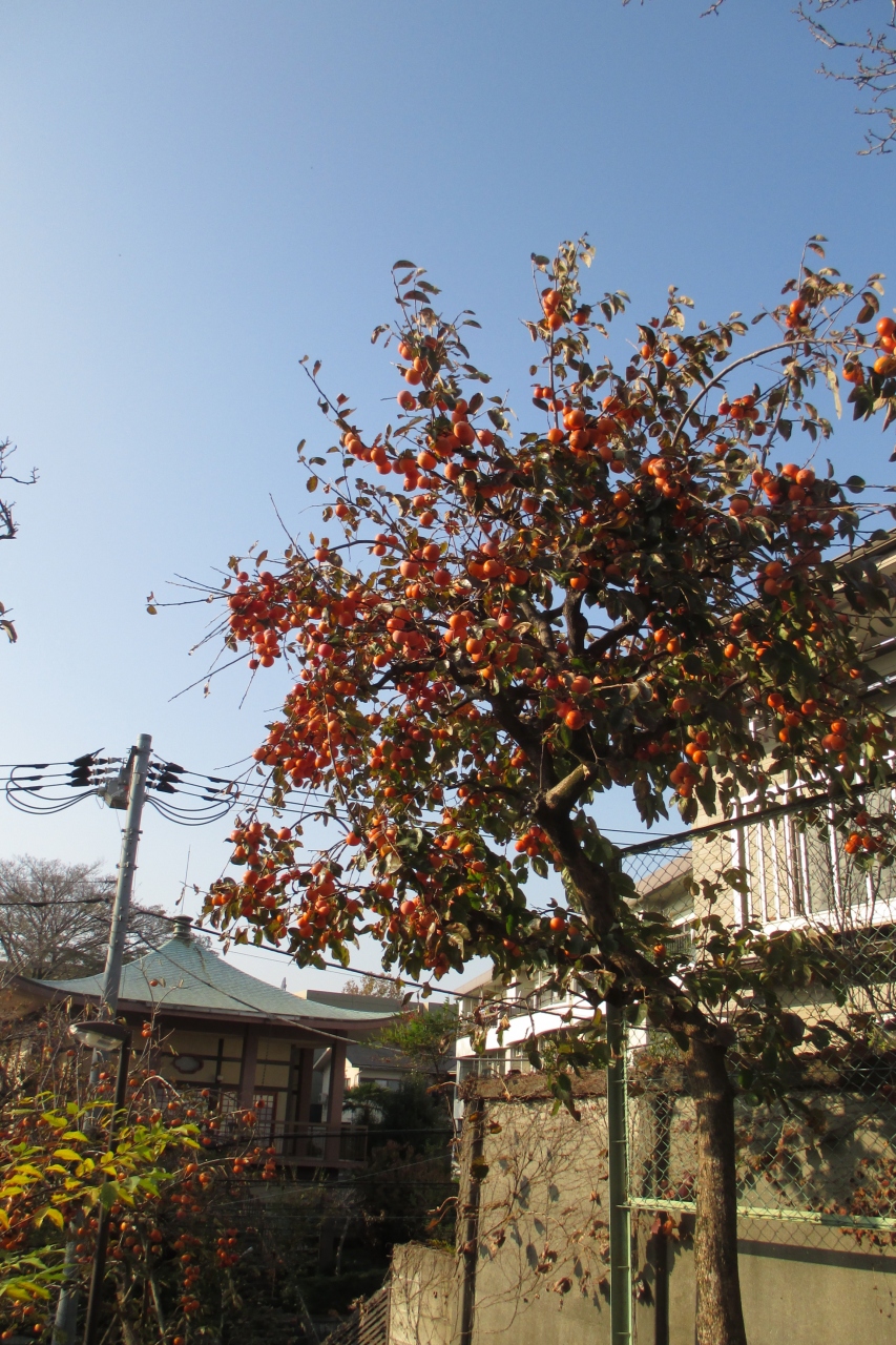 北からは細い通路、西側は薬罐坂からの狭い階段とアプローチはあまり良くはありません。秋に訪れましたが、小さいながら秋色いっぱいでした。まずは公園内の樹木が赤や黄色に紅葉していました。また、柿の木もあり、鈴なり状態に実を付けていました。誰も取っていかないということは渋柿でしょうか。それとも、単に柿の人気がないだけでしょうか。