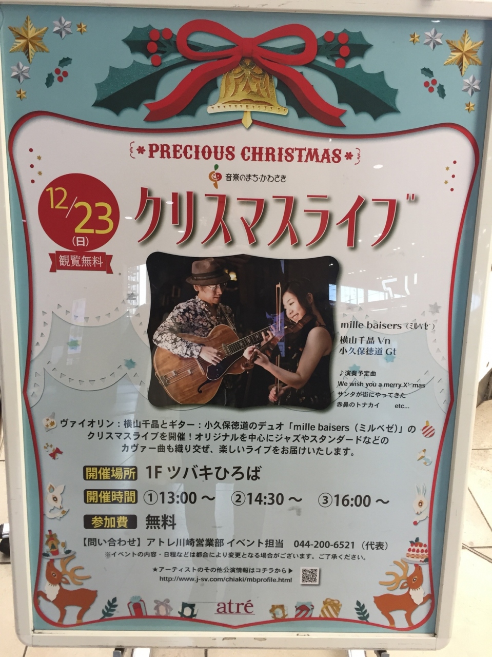 リニューアルされて 店舗も増え 楽しくなったアトレ川崎で12月23日 ギターとバイオリンのクリスマスライブが開催されるようです。1階のアフタヌーンティールームや、プラザの前のスペース(ツバキ広場)で無料で観覧出来るようですよ。有名なクリスマスソングやオリジナルの曲を演奏されるようです。