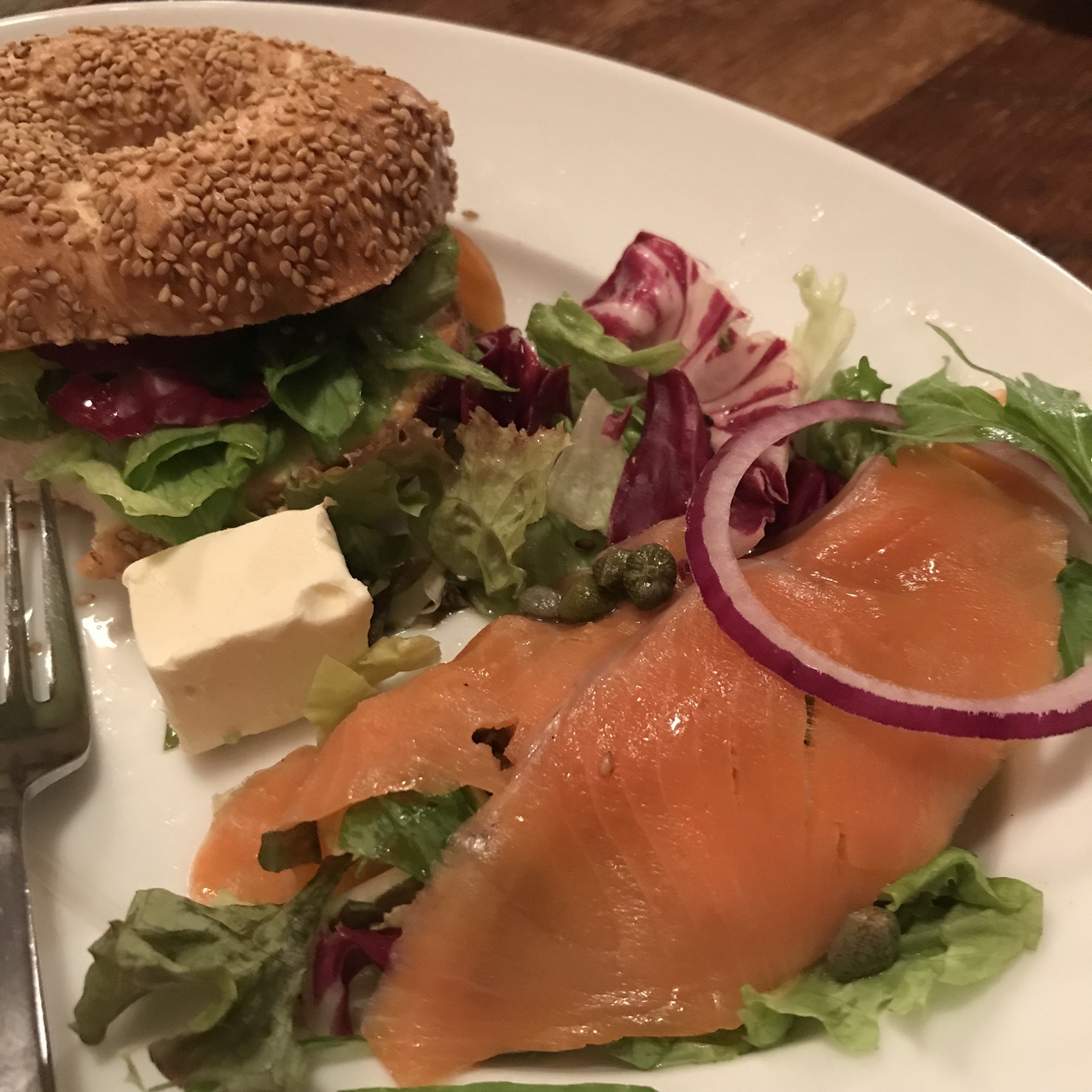 私はスモークサーモンとクリームチーズのベーグルサンドを注文しました。味は◎!けど、値段にしてはちょっと物足りない感じがしました。パンと中身が別々に盛られてるからそう見えるけど、ベーグルサンド一つだけと思うと、値段が高いなというイメージ。