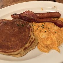 同僚はパンケーキセット頼みました。ソーセージが大きくて、ボリューム満点でした!塩辛いベーコンと甘いはちみつがうまくマッチして美味しい連呼してました。