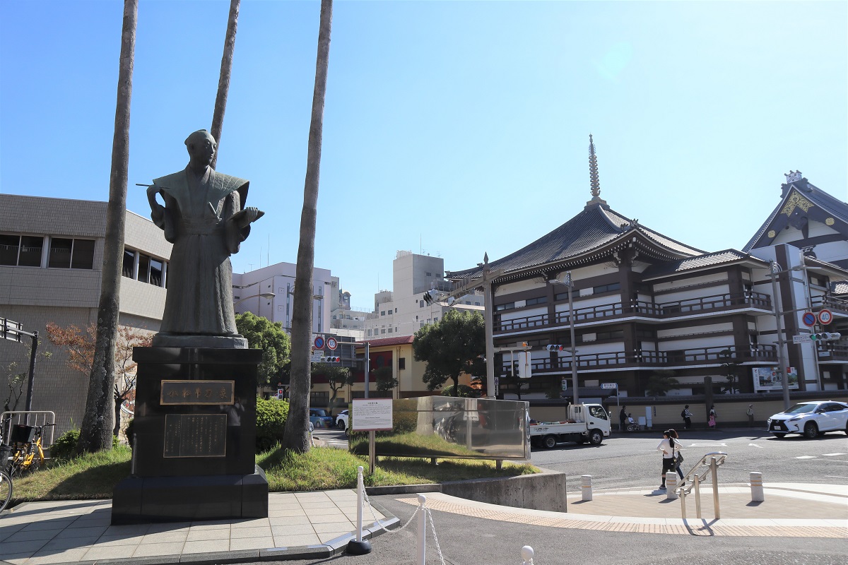 鶴丸城跡に隣接してある西郷隆盛の像。この像の近くに、向かうあう形で小松帯刀の像があります。中央公民館や音楽ホールのがある広場の一画、立派な台座の上に小松帯刀が立っています。左手に書、右手に筆を持ってというポーズです。