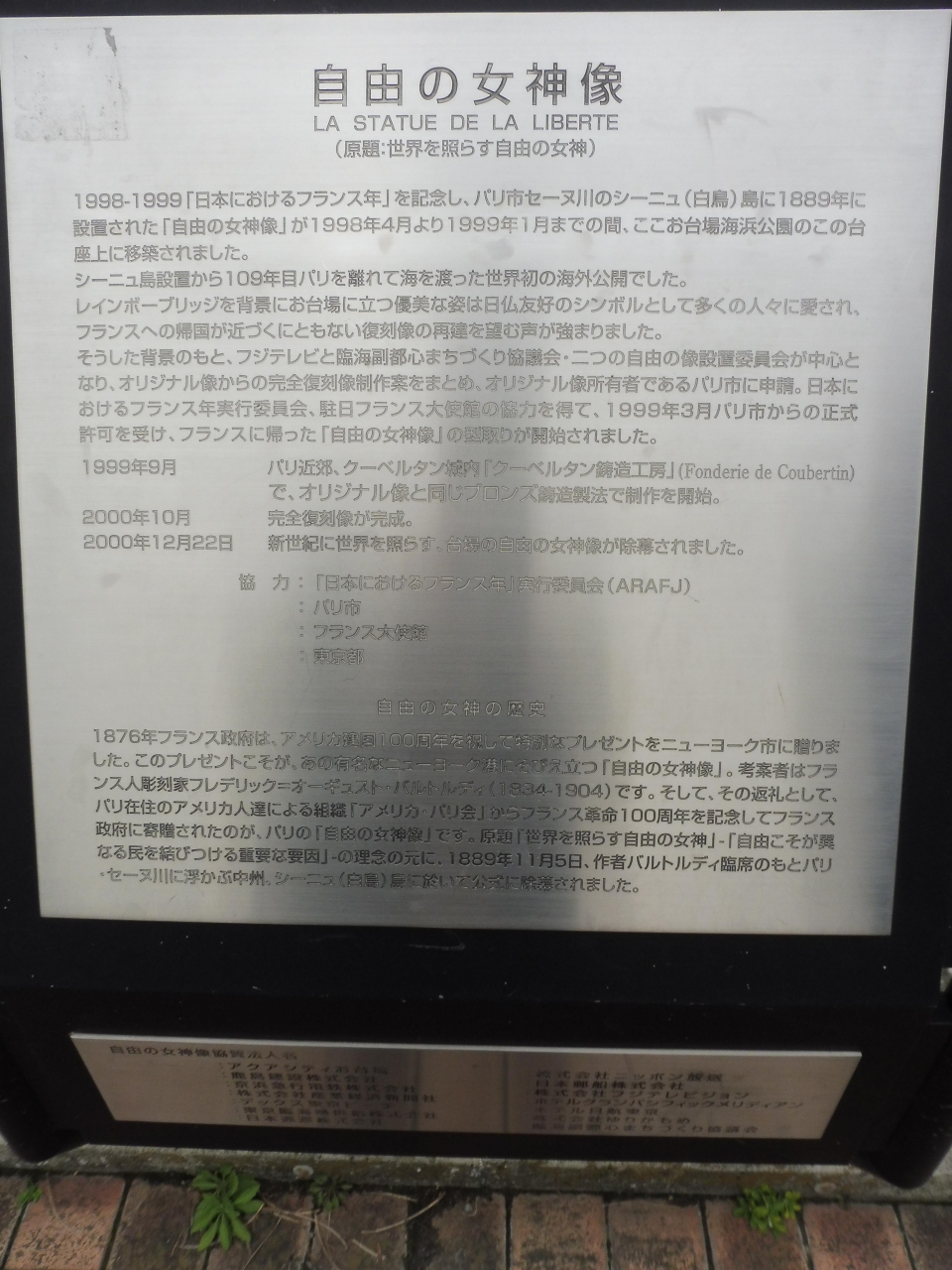 お台場海浜公園の中のレインボーブリッジ側に突然現れる「自由の女神」、これはフランス政府から日仏友好の為に日本に送られて来た「自由の女神」像です。