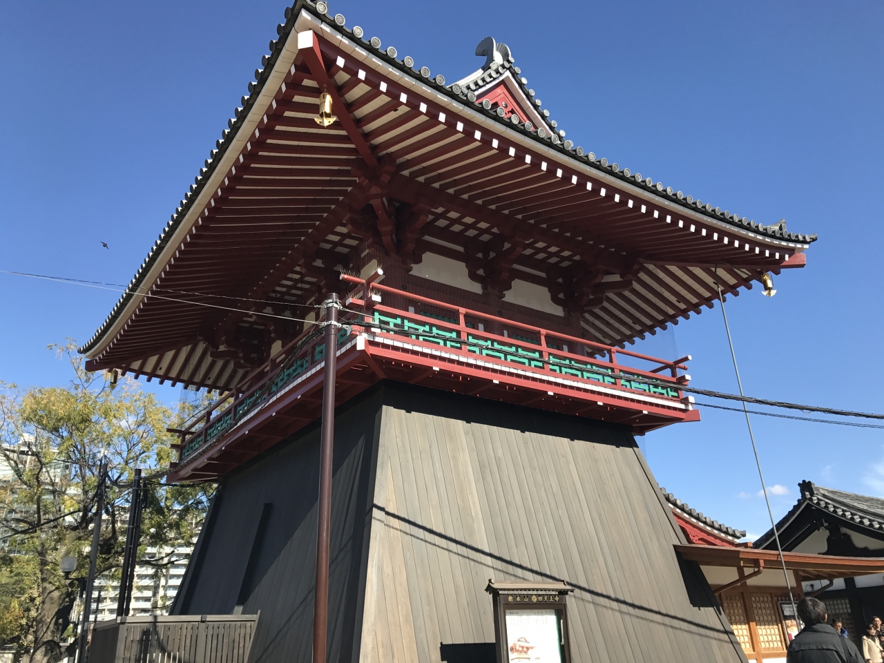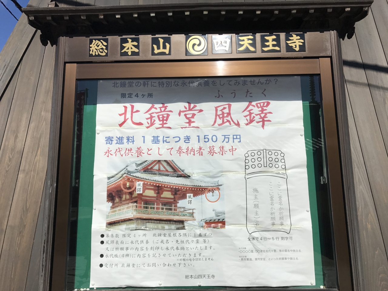 立派な太鼓楼です。内部見学はできませんが、大みそかに除夜の鐘が鳴らされるようです。大みそかに来るとまた違った景色が見れそうです。太鼓楼と小さな社務所のようなものが繋がっていて、中では永代供養の奉納者を募集しているようでした。四天王寺で永代供養してくれるんですね。
