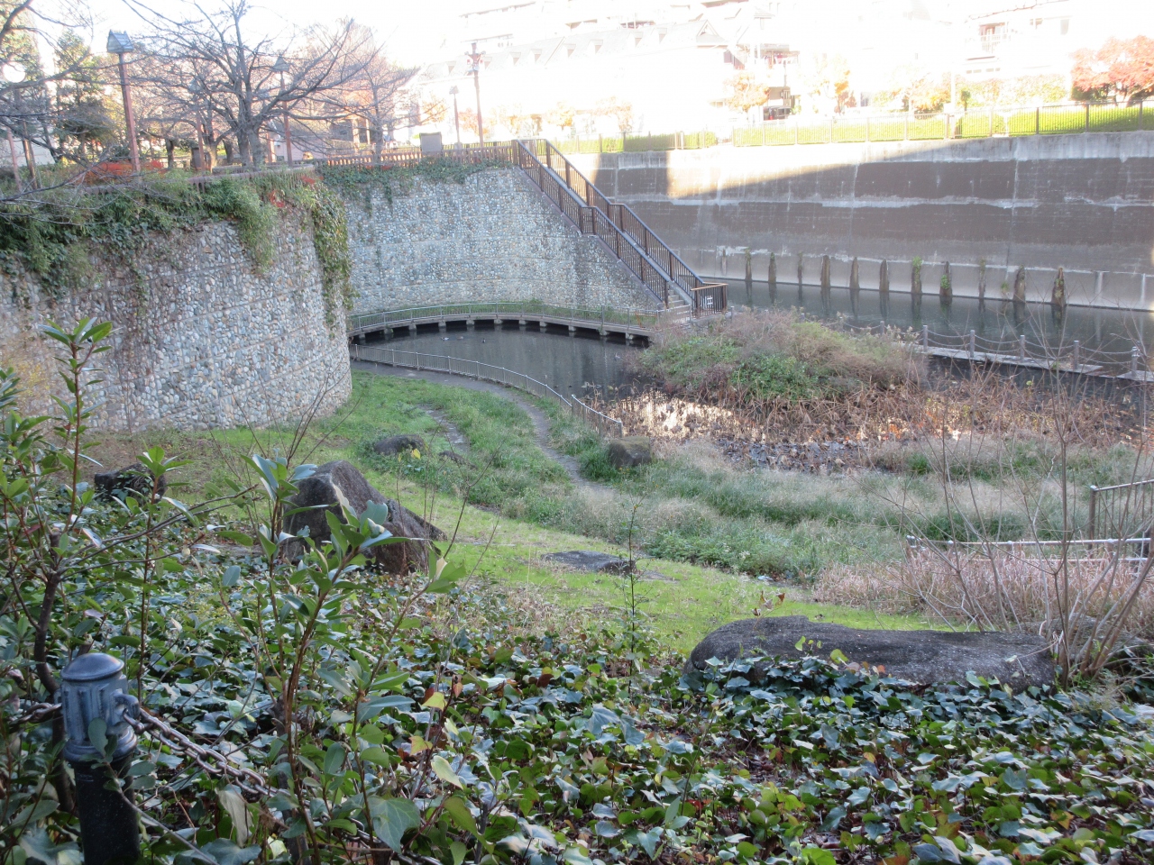 王子駅から石神井川沿いを板橋方向に10分ほど歩いたところにある、紅葉橋近くに造られた緑地広場です。すり鉢状になっていて、階段を下りたところに池があり、その周囲に遊歩道が設置されています。雨が降り水かさが増えると川と池が繋がり、カモが行き来しています。川沿いにはモミジや桜が植えられ、広場にはベンチが置かれ、シニアの方たちがのんびりくつろいでいます。あまり知られていませんが、桜の季節は桜の枝が川を覆い、最高の散策コースになります。