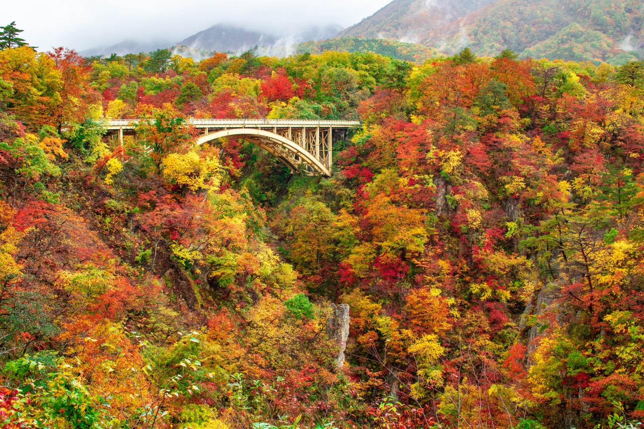 鳴子峡にかかる大深沢橋を見るならレストハウスからです。紅葉のベストの時期に訪れましたが、とても美しかったです。他の山や渓谷と違い、赤や緑、黄色と色んな鮮やかな色がとても華やかでした。こちらはキノコ汁が名物になっています。