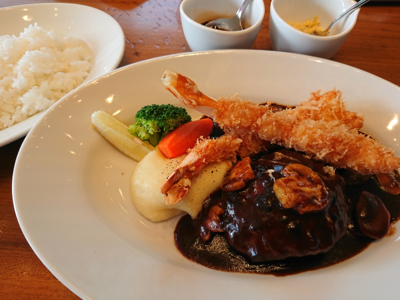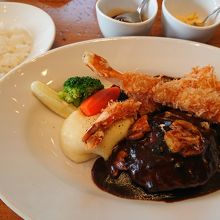 ハンバーグとエビフライのセットを注文。