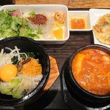 ビビンバとチゲのセットにしました。少量ですが、チヂミやおかずがついていて