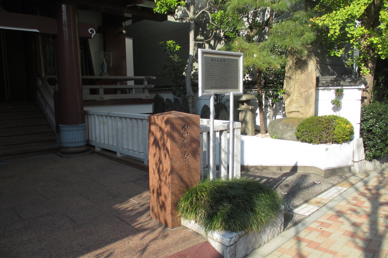 宗慶寺の正面、道路際に文京区教育委員会の設置した案内が立っています。宝篋印塔の墓碑はその後方、本堂階段横にさりげなく置かれています。何の案内も添えられていませんので、本物なのかと疑いたくなります。茶阿局は名はお久といい、どの様にして家康の側室になったかは諸説がある様ですが、一度は結婚をして、子をなしていたことは確かなようです。側室になってからは男子を2人産んでいますが、成人したのは長子:忠輝だけです。但し、まだ幕府の安定期に入っていなかったので恵まれた生涯は送れなかった人物です。茶阿局は、家康の没後は髪をおろして、当時は伝法院といっていた当寺を隠居所として、元和7年(1621年)に亡くなっています。