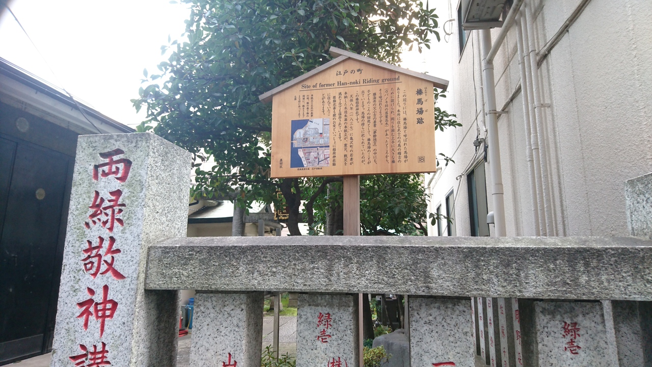 両国にある榛稲荷神社敷地内の道路沿いに榛馬場跡の高札が立っていました。ここにはかつて馬場があり、馬場を囲む土手に大きな榛があったので「榛馬場」と呼ばれたそうです。東西185m南北22mの馬場が明治の初めころまでありました。稲荷神社の名前に馬場の歴史を感じました。