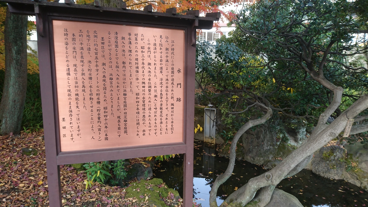 両国にある旧安田庭園には、隅田川の水を引き込んでいた水門があり、かつては潮の干満に伴って池の水位が上下に変化し、それによって変わる庭の景観を楽しんでいたそうです。隅田川の水質汚濁などによって水門は閉じられたそうですが、昔の人の庭園の楽しみ方は雅だなと思いました。