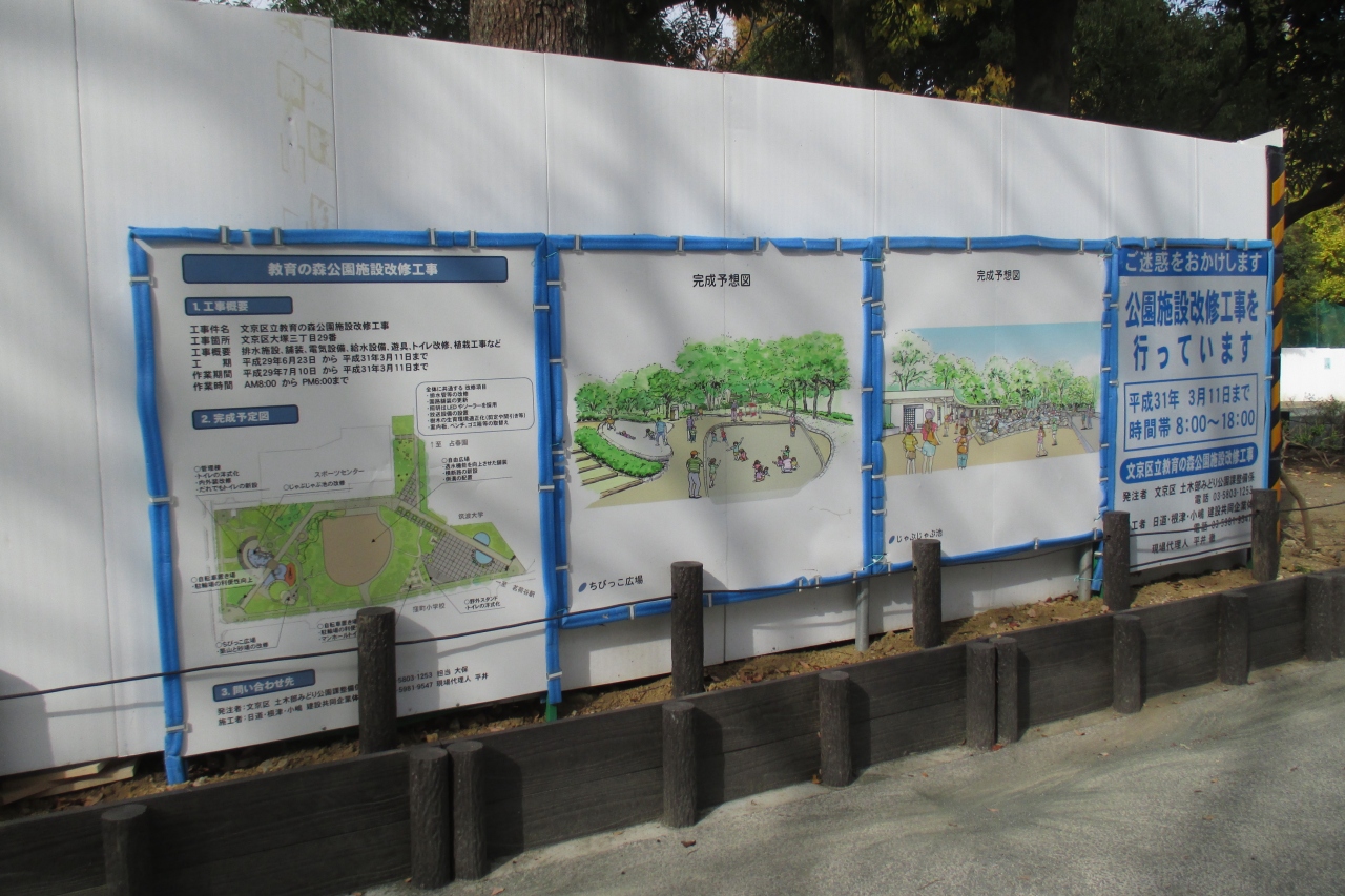 開園から30年経って、不具合を改修するという工事ですが、公園のメインの部分は白い壁で周囲を囲まれていましたが、最終段階に入っている様に見えました。工事は平成29年7月から平成31年3月までの長期間の予定で行われていて、自由広場から南側は工事が終わっているように見えました。
