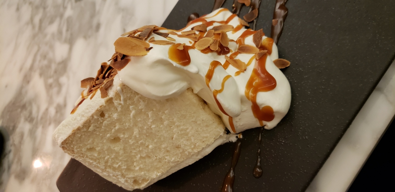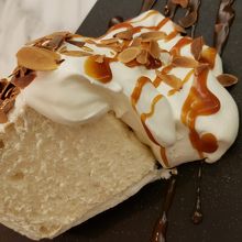 食後のデザートにこちらのキャラメルシフォンケーキを頂きました。まず見た目が素敵です。シフォンケーキにはふわっふわの生クリームがたっぷりかかり、その上にキャラメルソースとアーモンド。生クリームは甘過ぎずくどくなくてキャラメルソースともよく合います。シフォンケーキもふわふわもちもちで一口食べれば幸せいっぱいです。量もたっぷりでお腹いっぱいです。