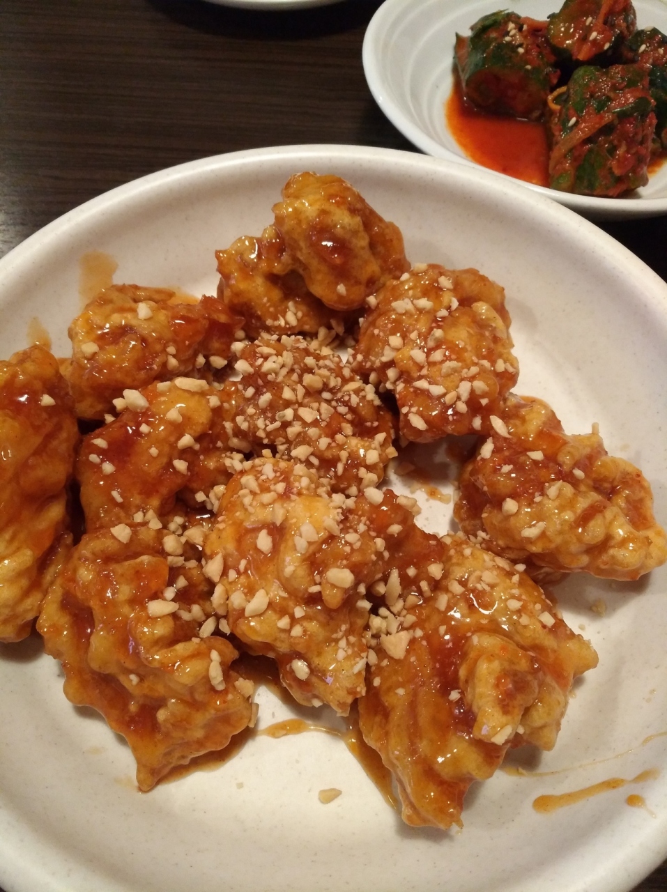 何度か利用させてもらってますが、今回は初めて骨無しのヤムニョムチキンを食べました。骨がないので、一つ一つが小振りで食べやすかったです。お箸だけでパクパク食べれるのがいいです。小腹を満たすためにちょろっと立ち寄ったので、次回はガッツリ食べたいと思います!