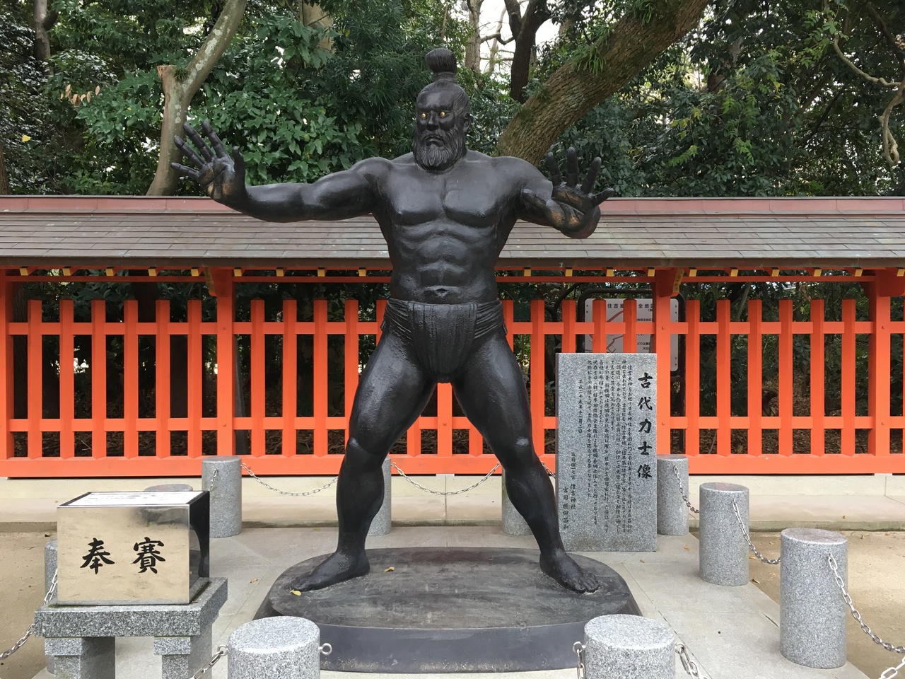 力士像は本殿横にあり。手相が力となっており、右手をさわるといいらしい。かなり巨大な像で驚いた。