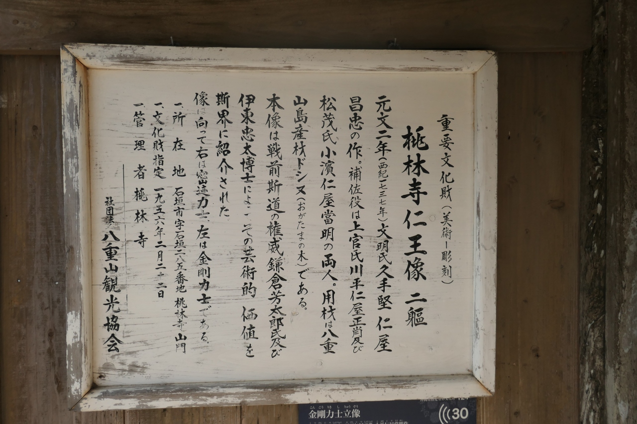 桃林寺の門には仁王像があり、重要文化財に指定されています。仁王門は石垣市内を通る主要道路脇に建っていました。門脇の古びた感じの説明文に、この像は1737年に造られたと書かれていました。京都や奈良のような町の寺院で仁王像を見るのは普通ですが、古の都から離れた石垣に歴史的な仁王像があるのは、多少の驚きでした。