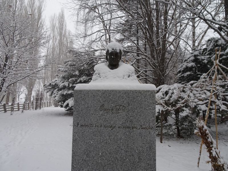 正門入ったところにも「新渡戸夫人寄贈のハルニレ」があるように、新渡戸稲造氏は札幌農学校で学び、教鞭をとった人物です。何故、構内中央付近でなく、外れの花木園に銅像があるのかが分かりませんでした。